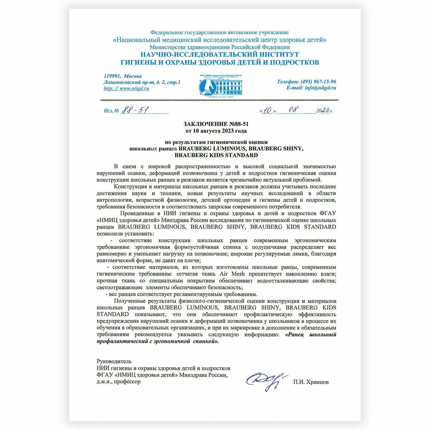 Ранцы BRAUBERG KIDS STANDARD протестированы НИИ гигиены и охраны здоровья детей и подростков ФГАУ "Национальный медицинский исследовательский центр здоровья детей". В рамках проведенных исследований* было установлено, что конструкции и материалы ученических ранцев соответствуют современным эргономическим требованиям и способствуют формированию здоровой осанки у школьников.