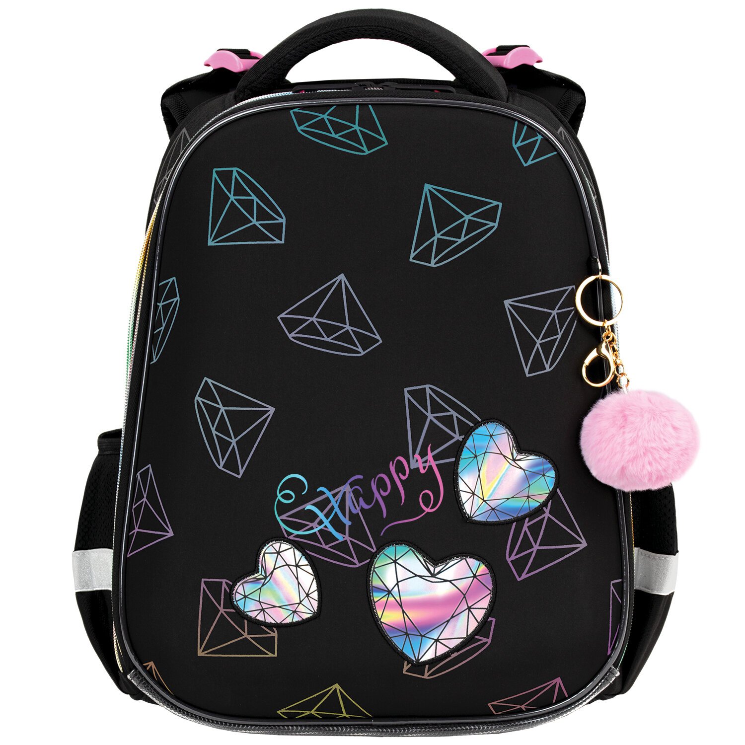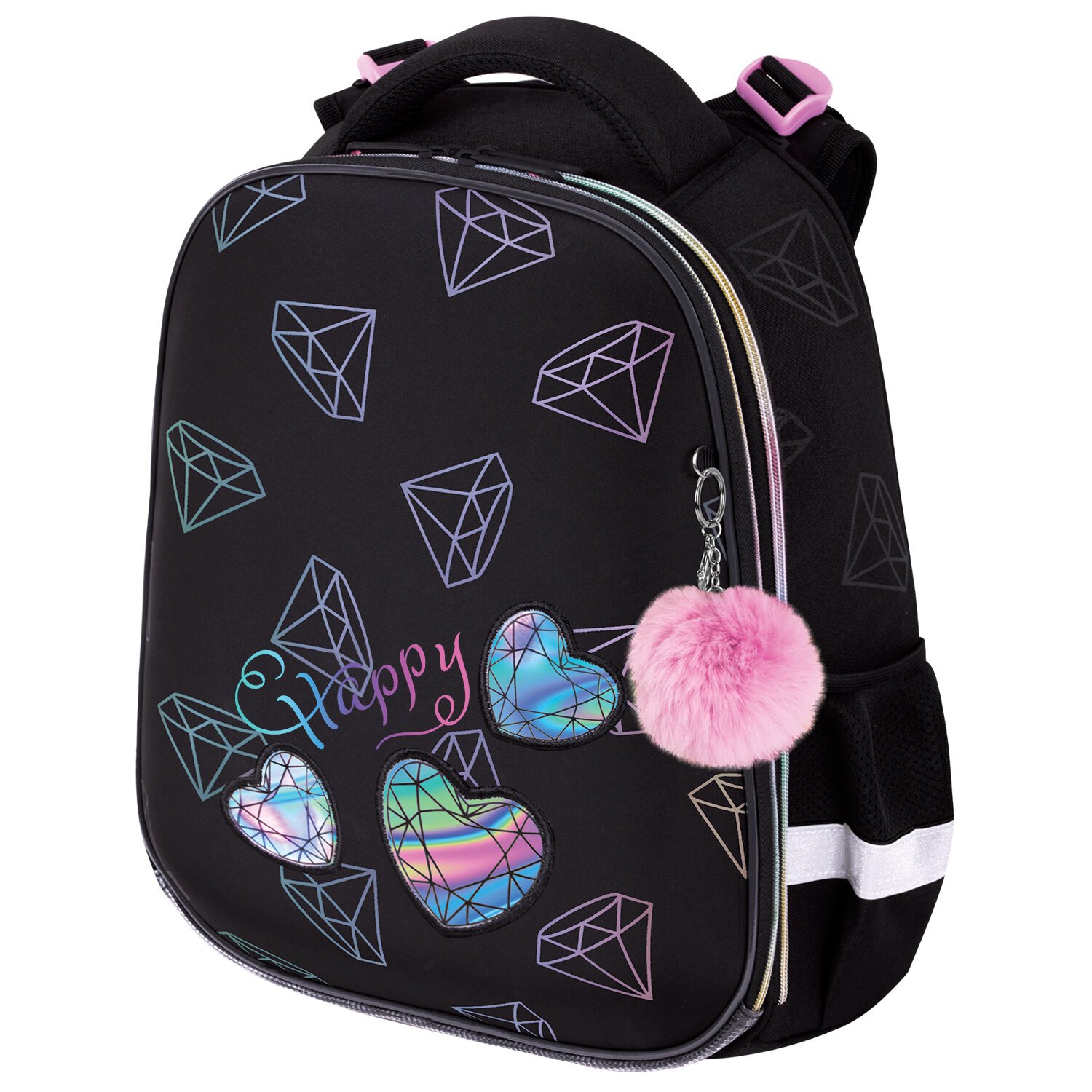 Дизайн передней панели ранца реализован с использованием уникального светоотражающего принта: при попадании искусственного света ранец переливается разноцветным свечением, тем самым привлекая внимание и повышая безопасность ребенка в темное время суток. Голографическая аппликация на передней панели и пушистый брелок дополняют дизайн ранца.