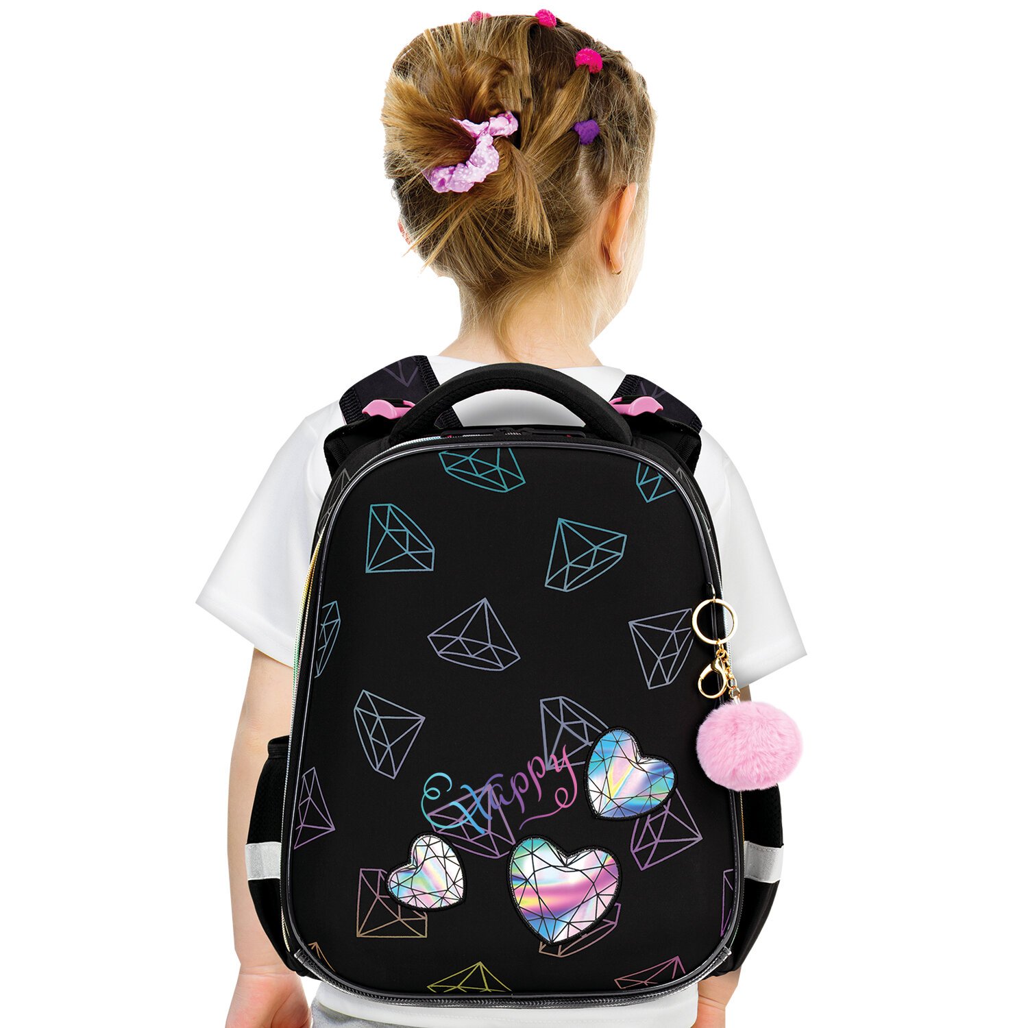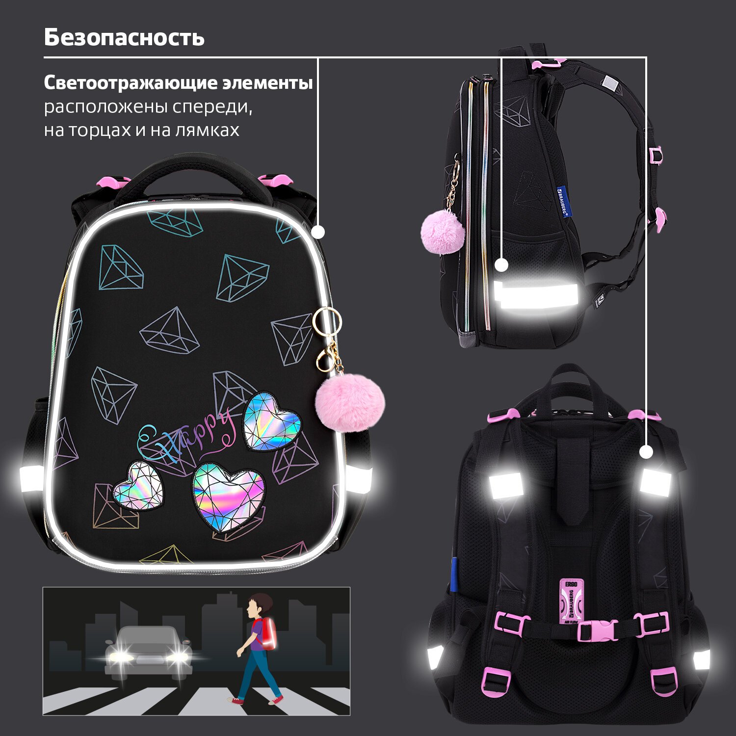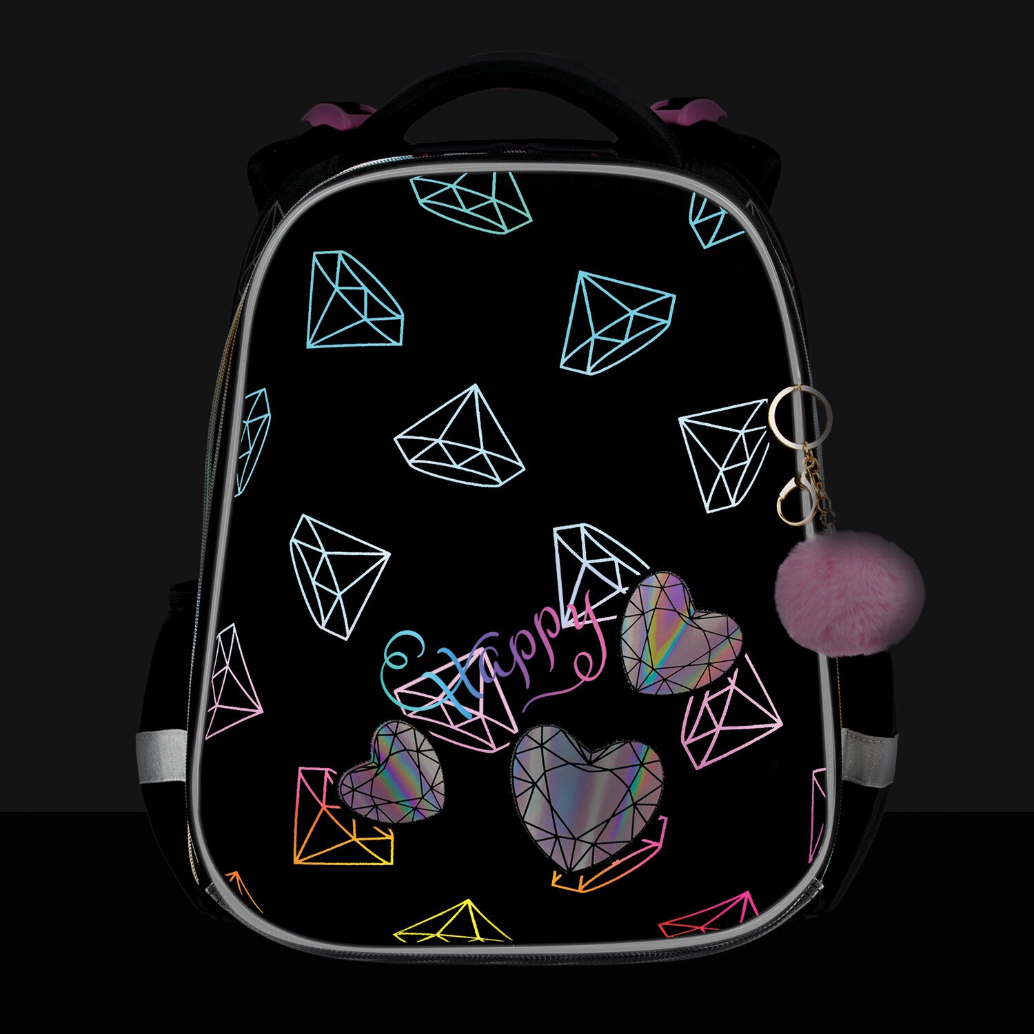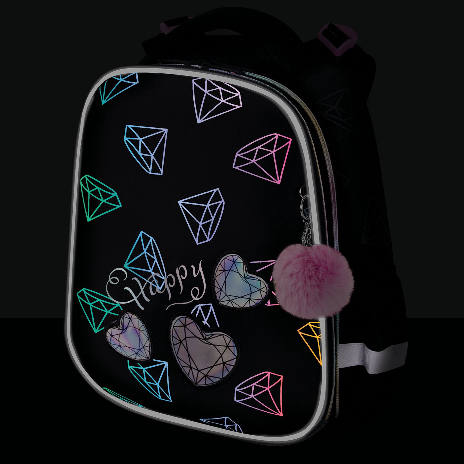 Ранец BRAUBERG LUMINOUS, 2 отделения, с брелоком, "Diamonds", СВЕТЯЩИЙСЯ РИСУНОК, 38х29х16 см, 272070