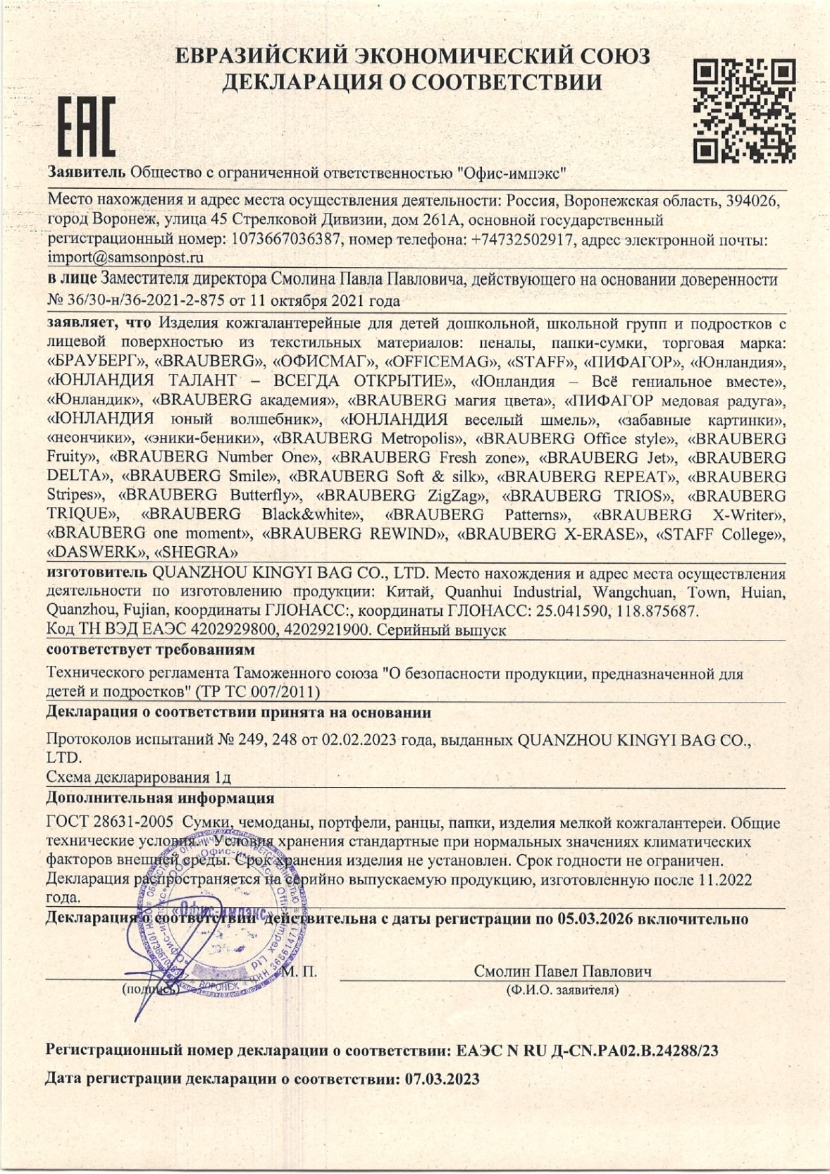 Ранцы BRAUBERG LUMINOUS протестированы НИИ гигиены и охраны здоровья детей и подростков ФГАУ "Национальный медицинский исследовательский центр здоровья детей". В рамках проведенных исследований* было установлено, что конструкции и материалы ученических ранцев соответствуют современным эргономическим требованиям и способствуют формированию здоровой осанки у школьников.