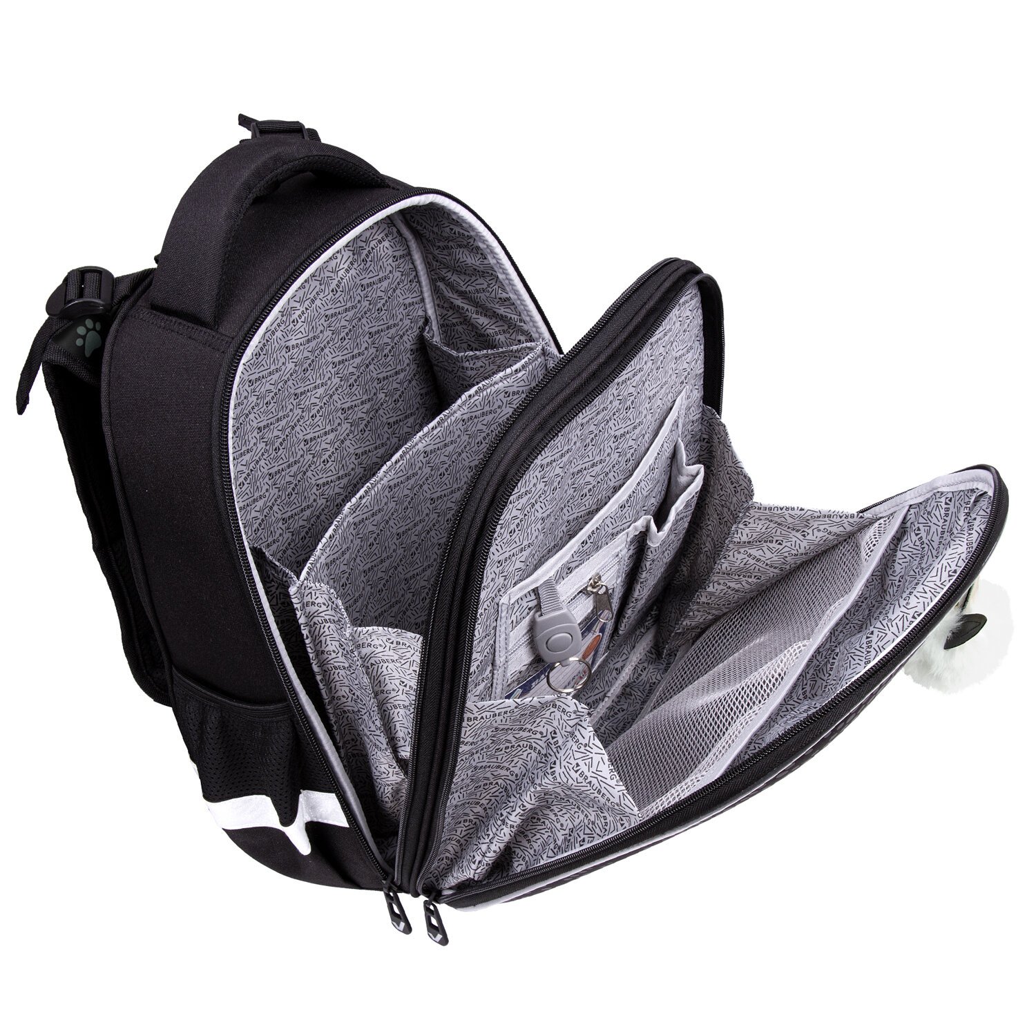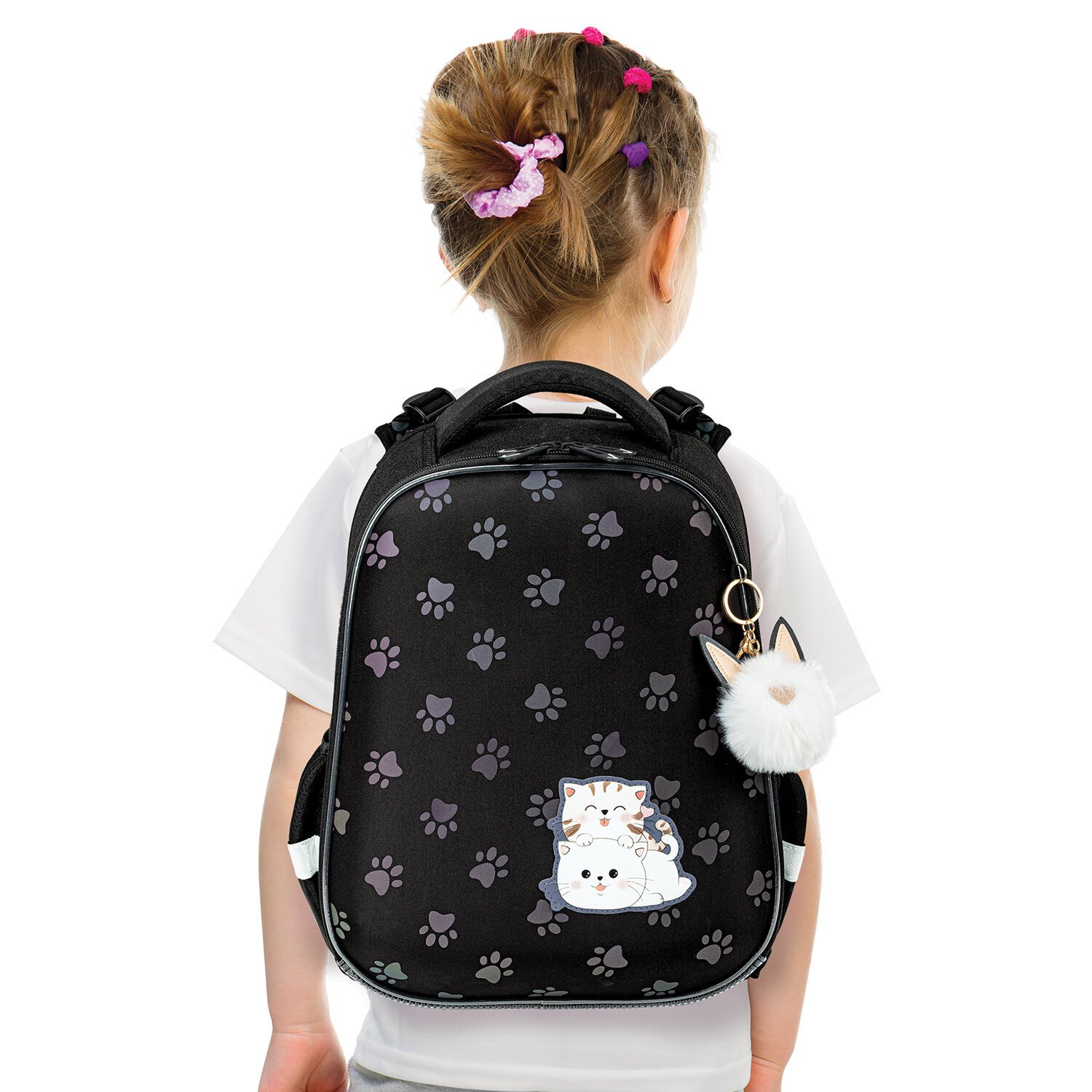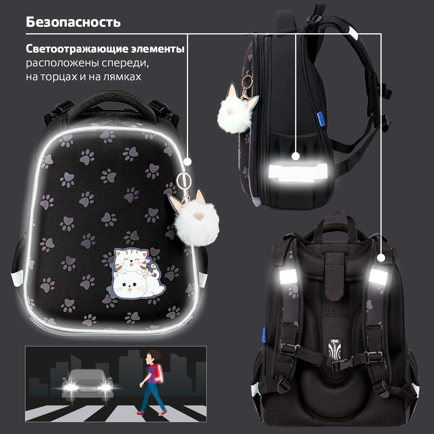 Дизайн передней панели ранца реализован с использованием уникального светоотражающего принта: при попадании искусственного света ранец переливается разноцветным свечением, тем самым привлекая внимание и повышая безопасность ребенка в темное время суток. Аппликация из экокожи на передней панели и пушистый брелок дополняют дизайн ранца.