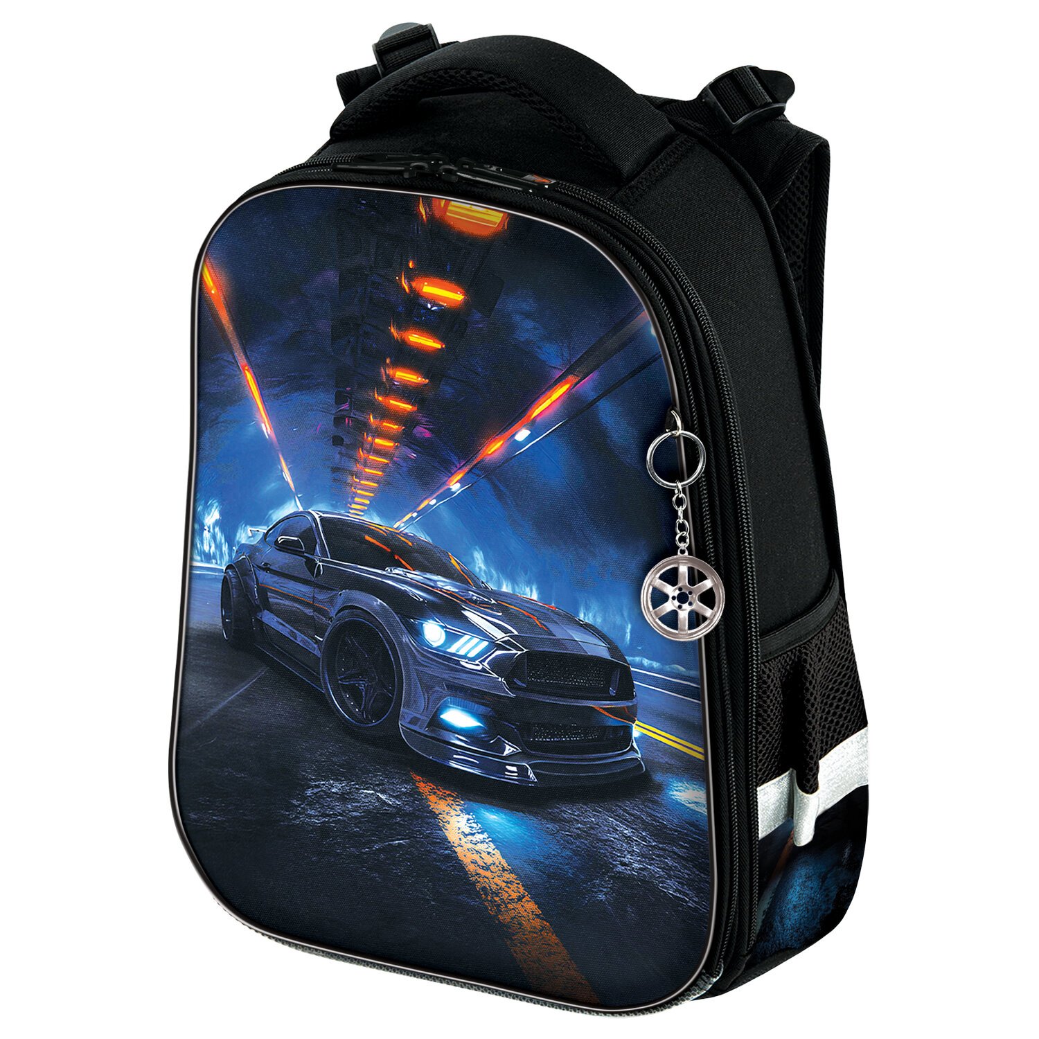 Рисунок на передней панели ранца выполнен с применением ярких контрастных цветов, а оригинальный брелок-подвеска дополняет дизайн ранца.