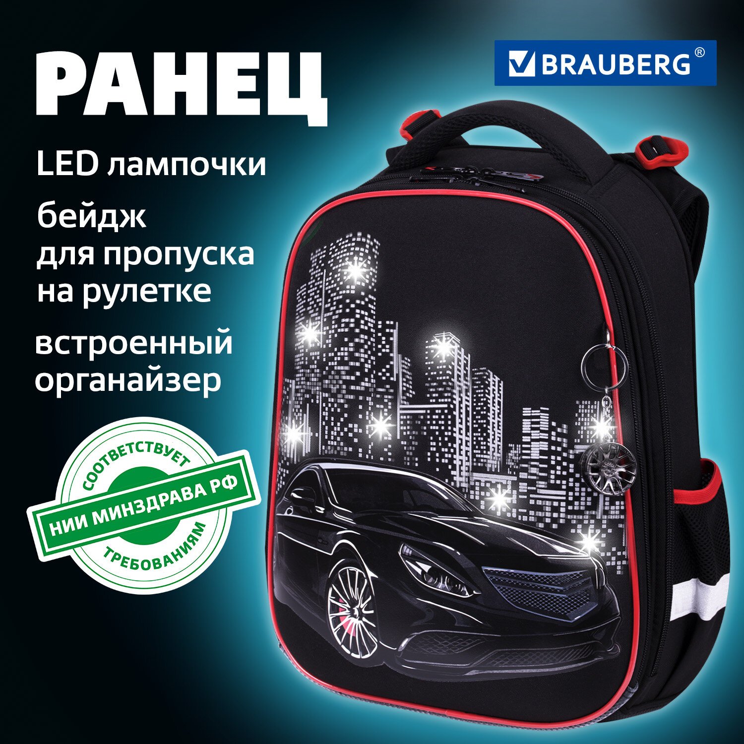 Ранец BRAUBERG PREMIUM, 2 отделения, с брелком, "City car", LED ЛАМПОЧКИ, 38х29х16 см, 271356
