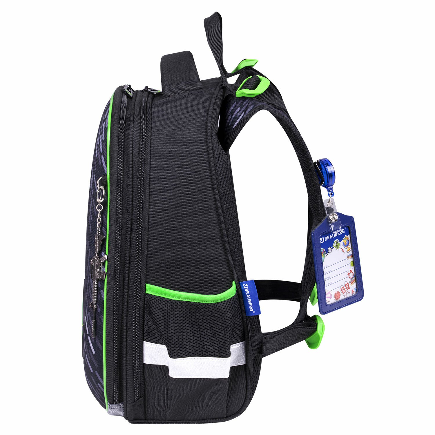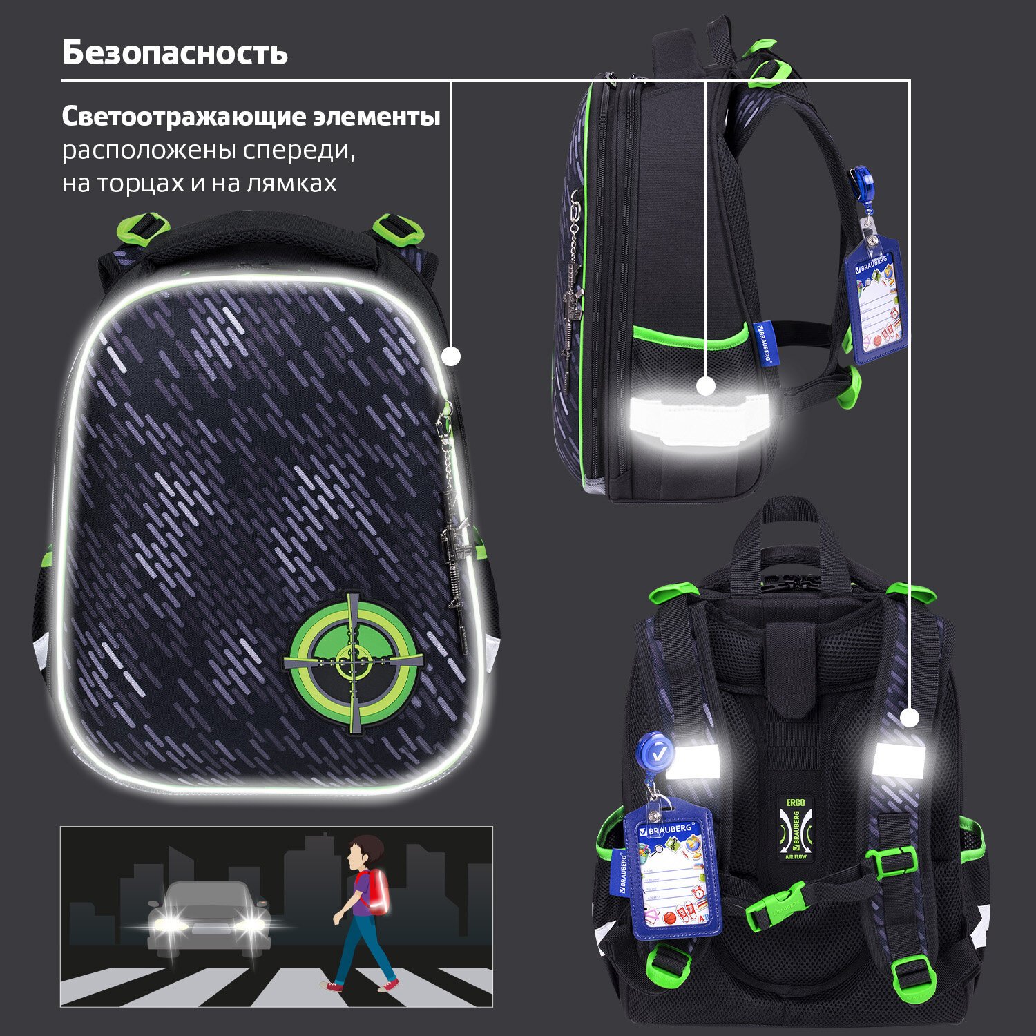 Светоотражающие элементы ранца расположены спереди, на торцах и на лямках. Они необходимы для безопасности пользователя в темное время суток.
