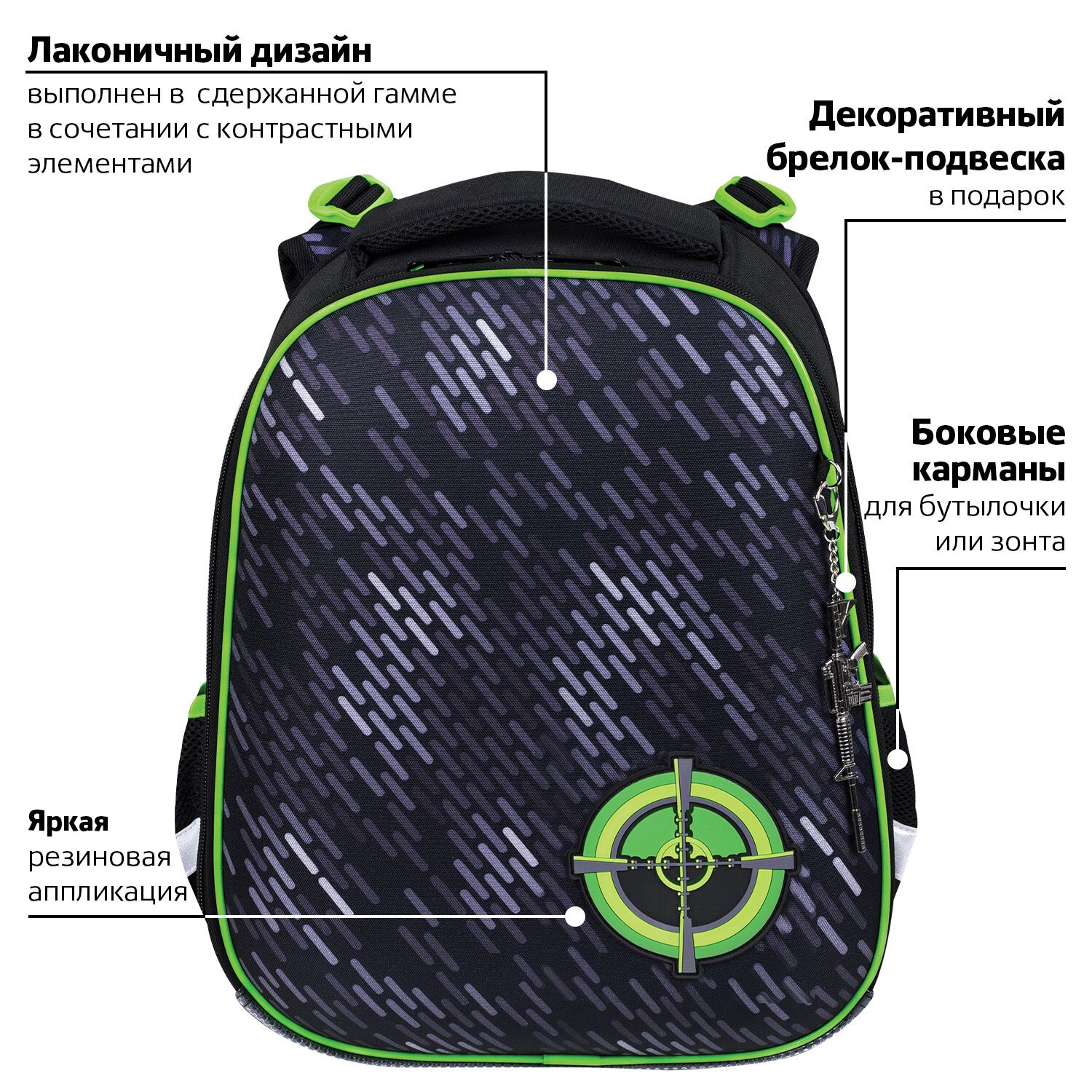 Лаконичный дизайн ранца подчеркивает сдержанная цветовая гамма в сочетании с контрастными элементами. Резиновая аппликация и оригинальный брелок-подвеска прекрасно дополняют тематику дизайна, благодаря чему ранец выглядит современно.