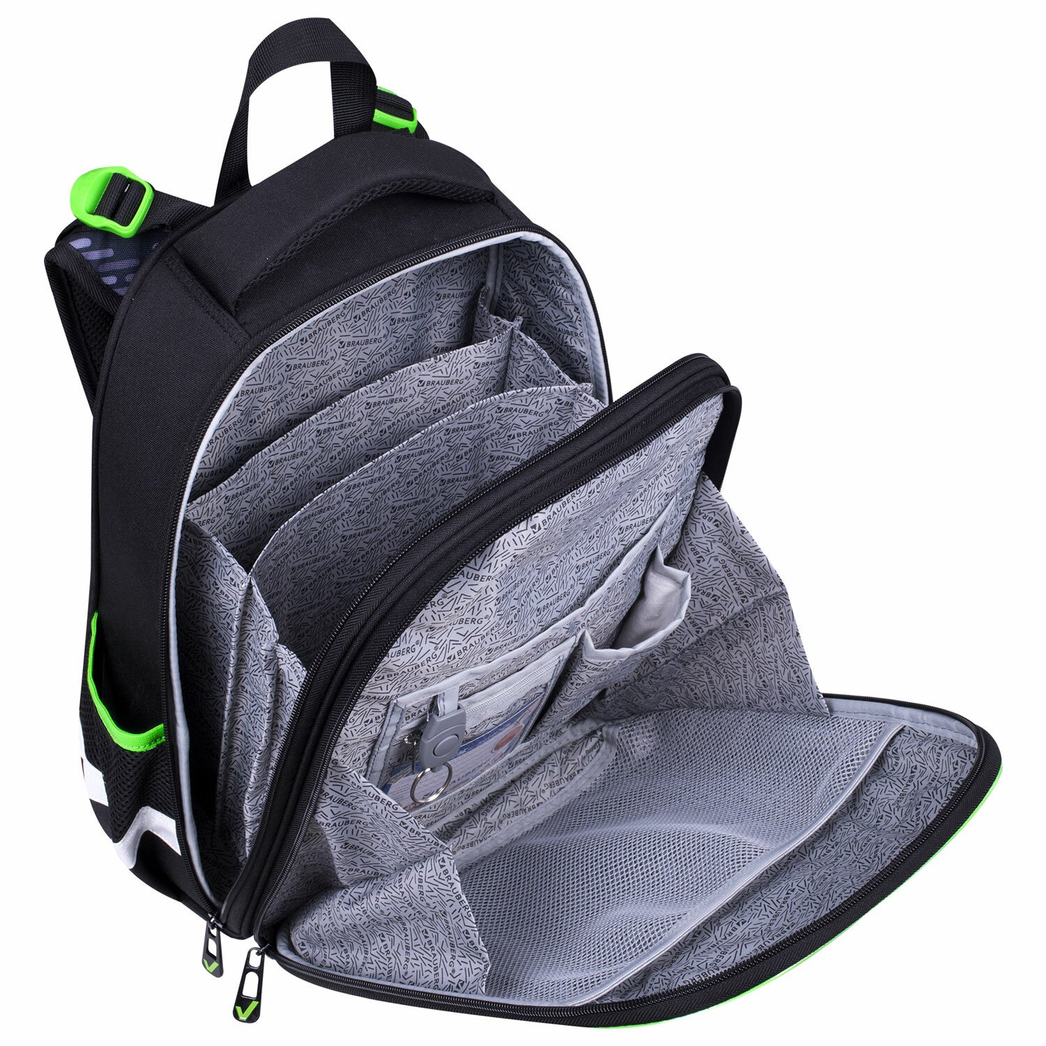 В основном отделении ранца можно легко и быстро разместить учебники и тетради между двумя плотными перегородками. Внутри фронтального отделения находится органайзер для канцтоваров, именная карточка, карман для телефона, съёмный карабин для ключей и большое отделение из сетки. Такая организация пространства поможет держать принадлежности в сохранности и приучить ребенка к порядку. Ранец широко раскрывается, повышая удобство использования, а за счёт боковых перегородок содержимое не выскользнет из ранца.