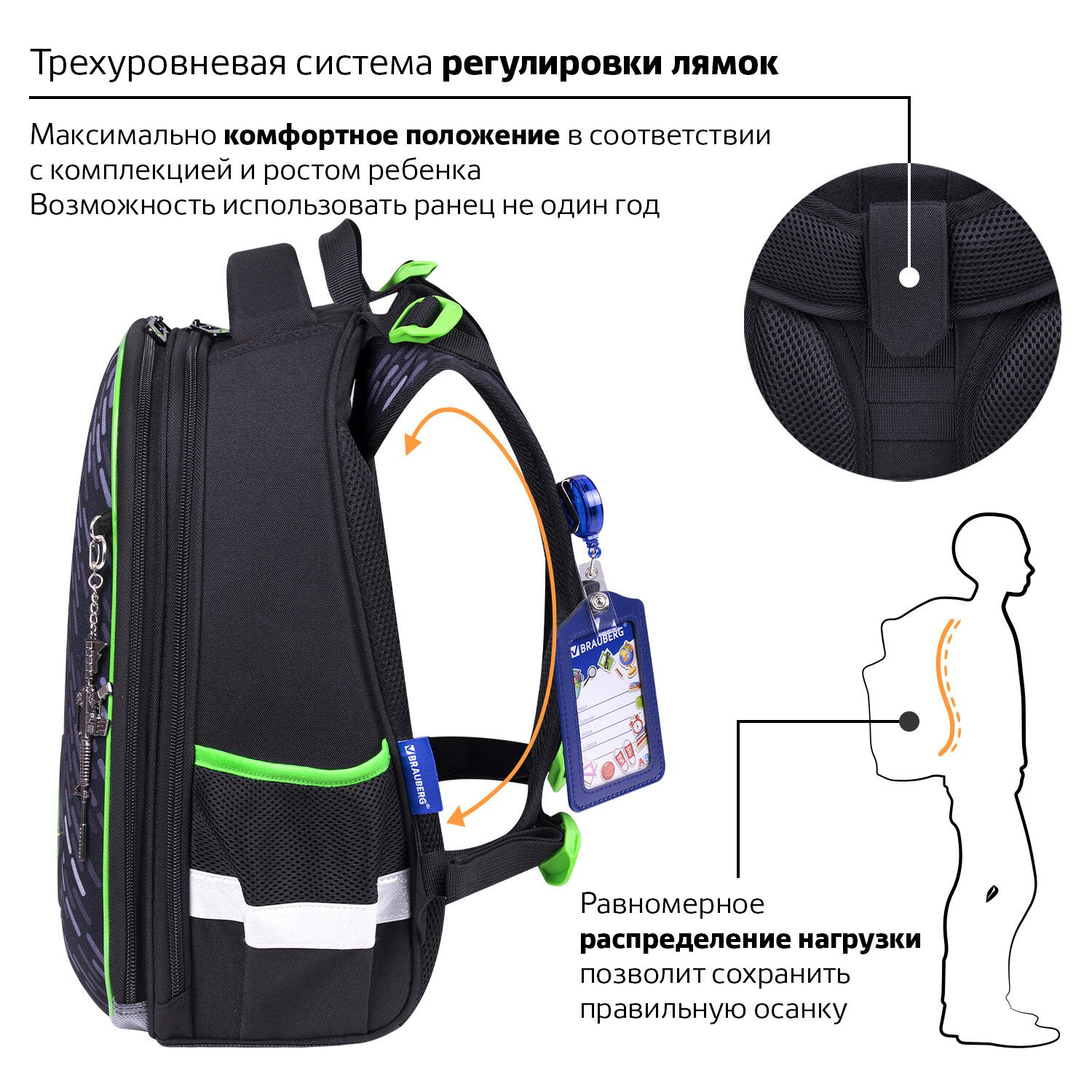 Ранцы BRAUBERG PREMIUM протестированы НИИ гигиены и охраны здоровья детей и подростков ФГАУ "Национальный медицинский исследовательский центр здоровья детей". В рамках проведенных исследований* было установлено, что конструкции и материалы ученических ранцев соответствуют современным эргономическим требованиям и способствуют формированию здоровой осанки у школьников.