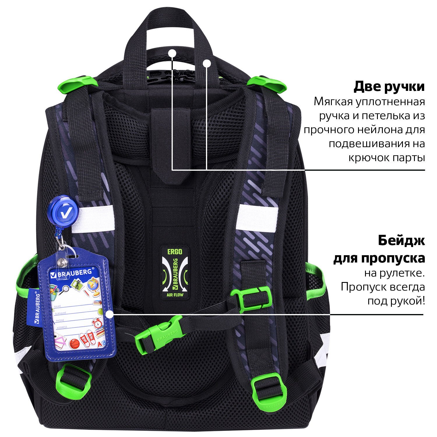 В комплекте с ранцем поставляется бейдж для пропуска на рулетке. Для его надёжной фиксации на одной из лямок ранца имеется специальное металлическое кольцо. Это очень удобно и экономит массу времени - ребенок просто прикладывает пропуск к турникету, вытягивая его на нужное расстояние, а затем рулетка автоматически возвращается его обратно. Пропуск всегда под рукой!