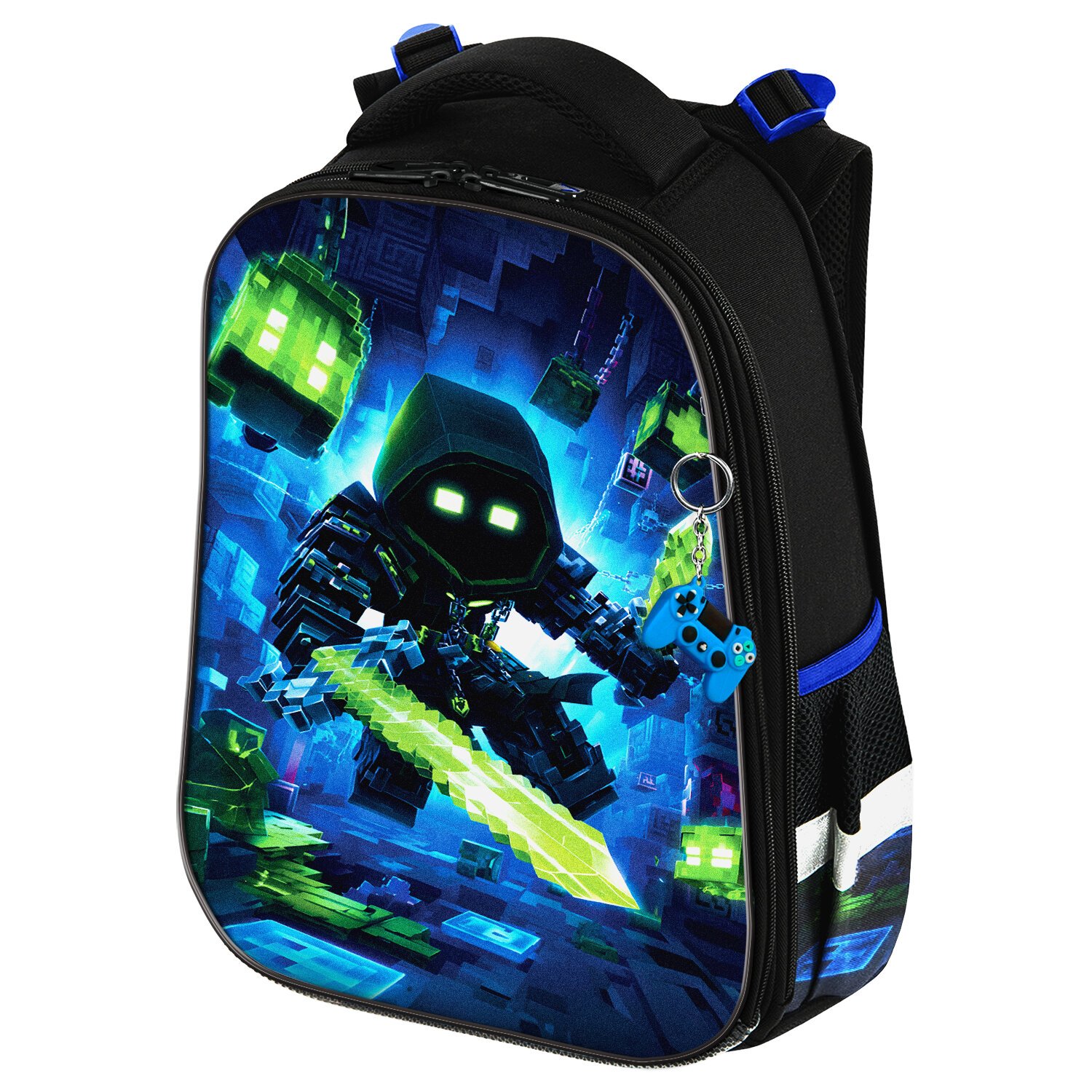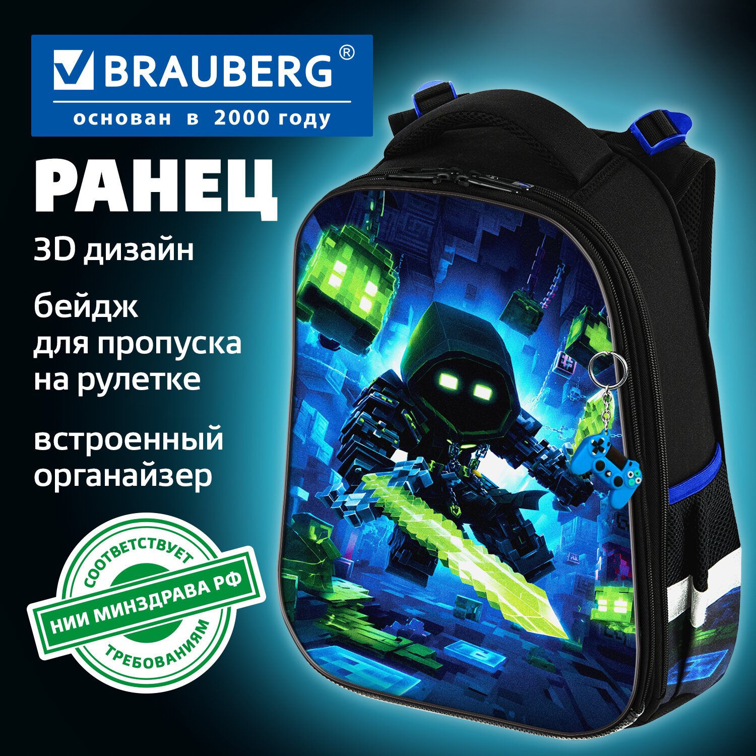 На передней панели ранца реализован уникальный 3D-эффект – выпуклое рельефное изображение воина из компьютерной игры! Сочетание ярких контрастных цветов привлекает внимание, а оригинальный брелок в форме геймпада дополняет дизайн ранца.