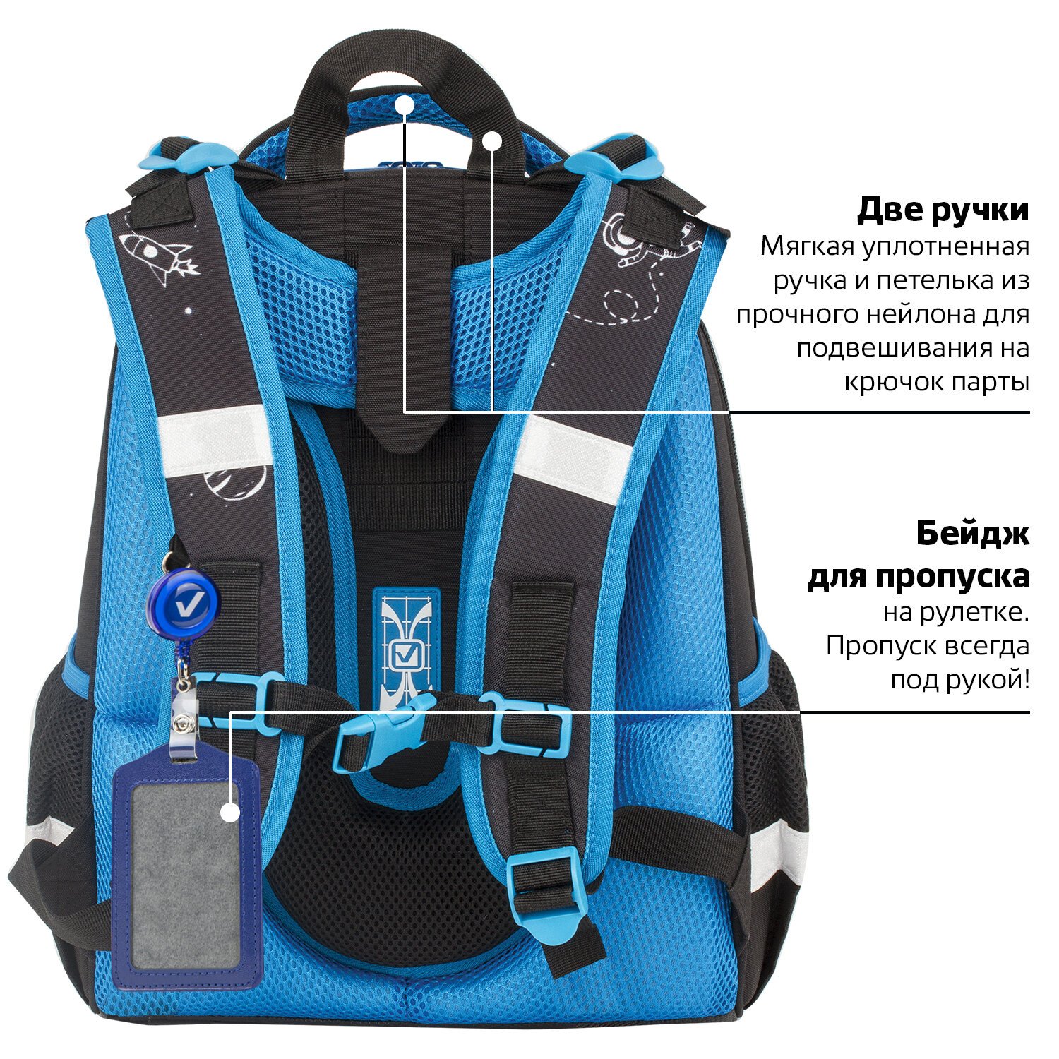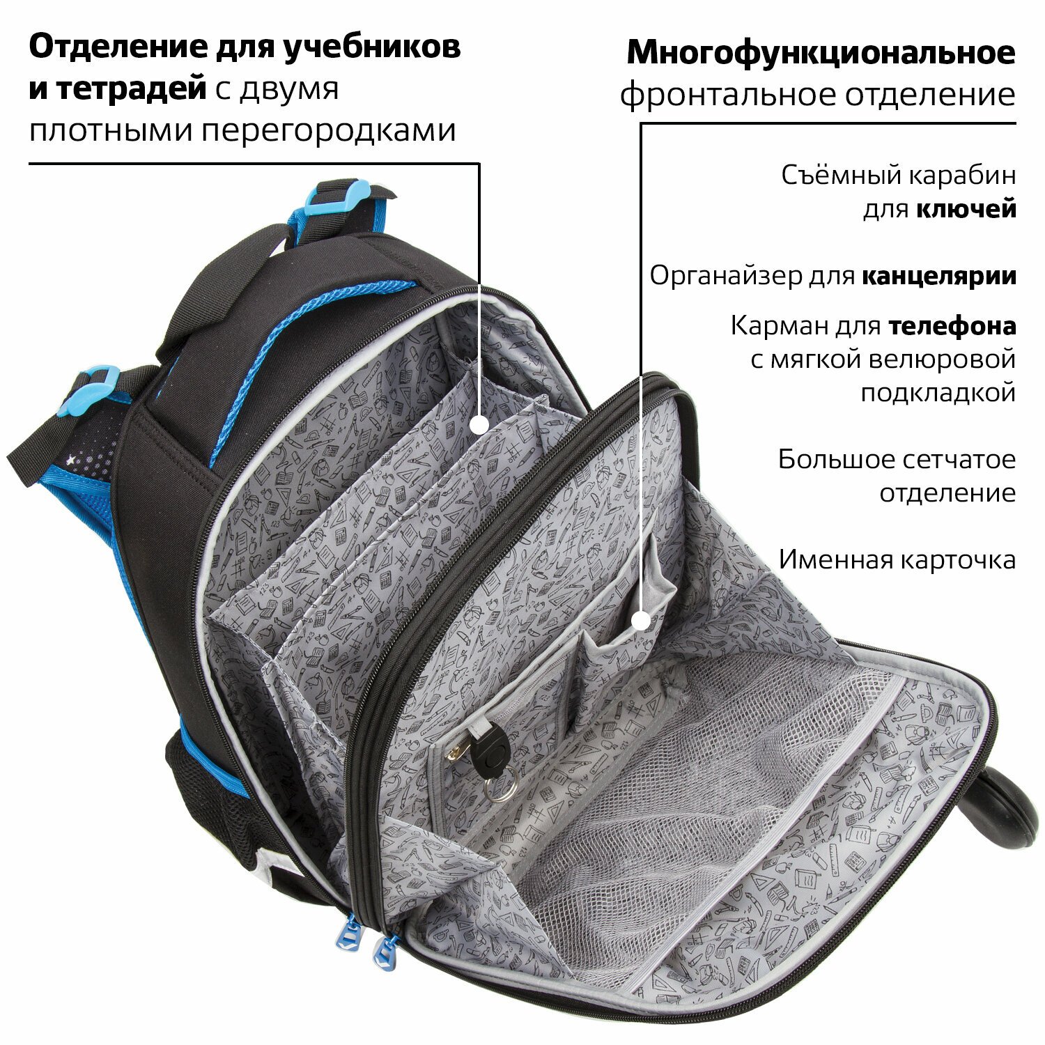 В основном отделении ранца можно легко и быстро разместить учебники и тетради между двумя плотными перегородками. Внутри фронтального отделения находится органайзер для канцтоваров, карман для телефона, съёмный карабин для ключей и большое отделение из сетки. Такая организация пространства поможет держать принадлежности в сохранности и приучить ребенка к порядку. Ранец широко раскрывается, повышая удобство использования, а за счёт боковых перегородок содержимое не выскользнет из ранца.