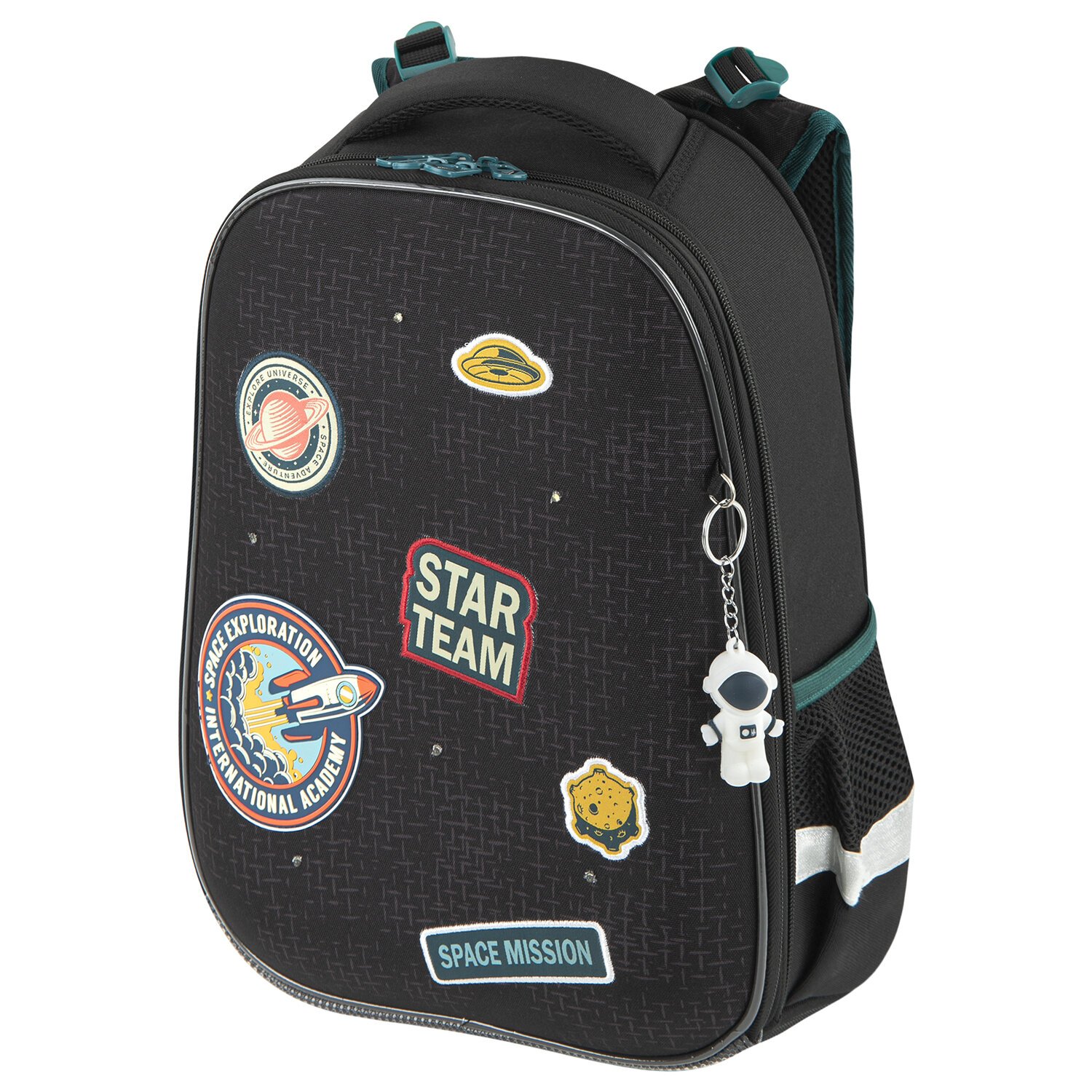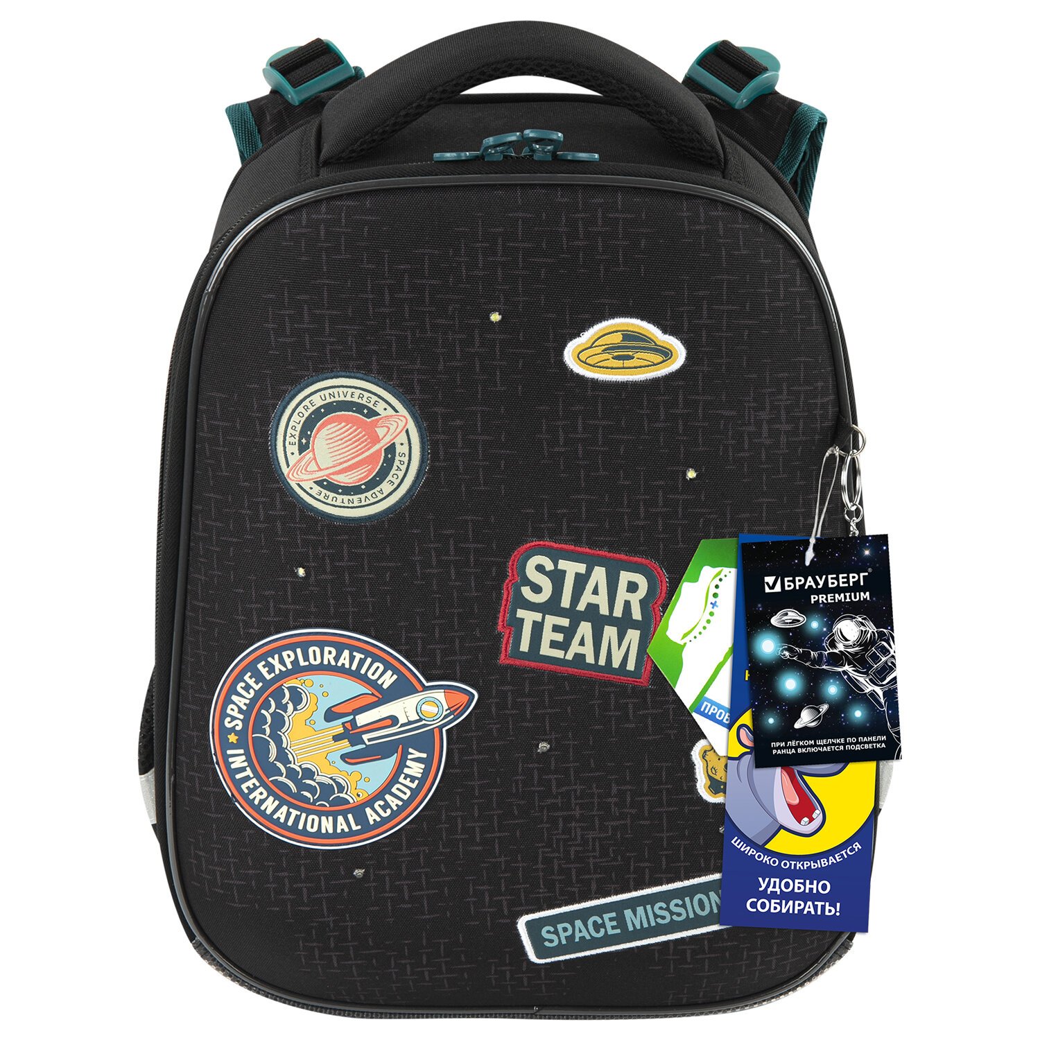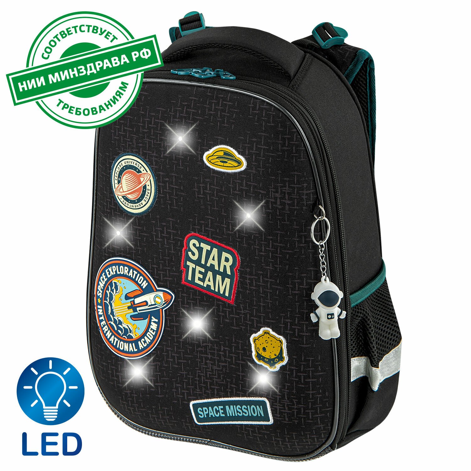 Ранец BRAUBERG PREMIUM, 2 отделения, с брелком, "Space mission", LED ЛАМПОЧКИ, 38х29х16 см, 270599