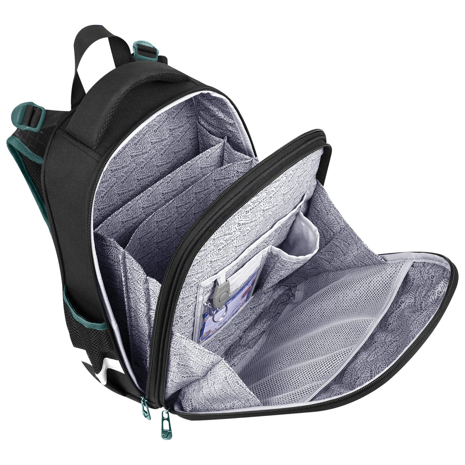 В основном отделении ранца можно легко и быстро разместить учебники и тетради. Внутри фронтального отделения находится органайзер для канцтоваров, именная карточка, карман для телефона, съёмный карабин для ключей и большое отделение из сетки. Такая организация пространства поможет держать принадлежности в сохранности и приучить ребенка к порядку. Ранец широко раскрывается, повышая удобство использования, а за счёт боковых перегородок содержимое не выскользнет из ранца.