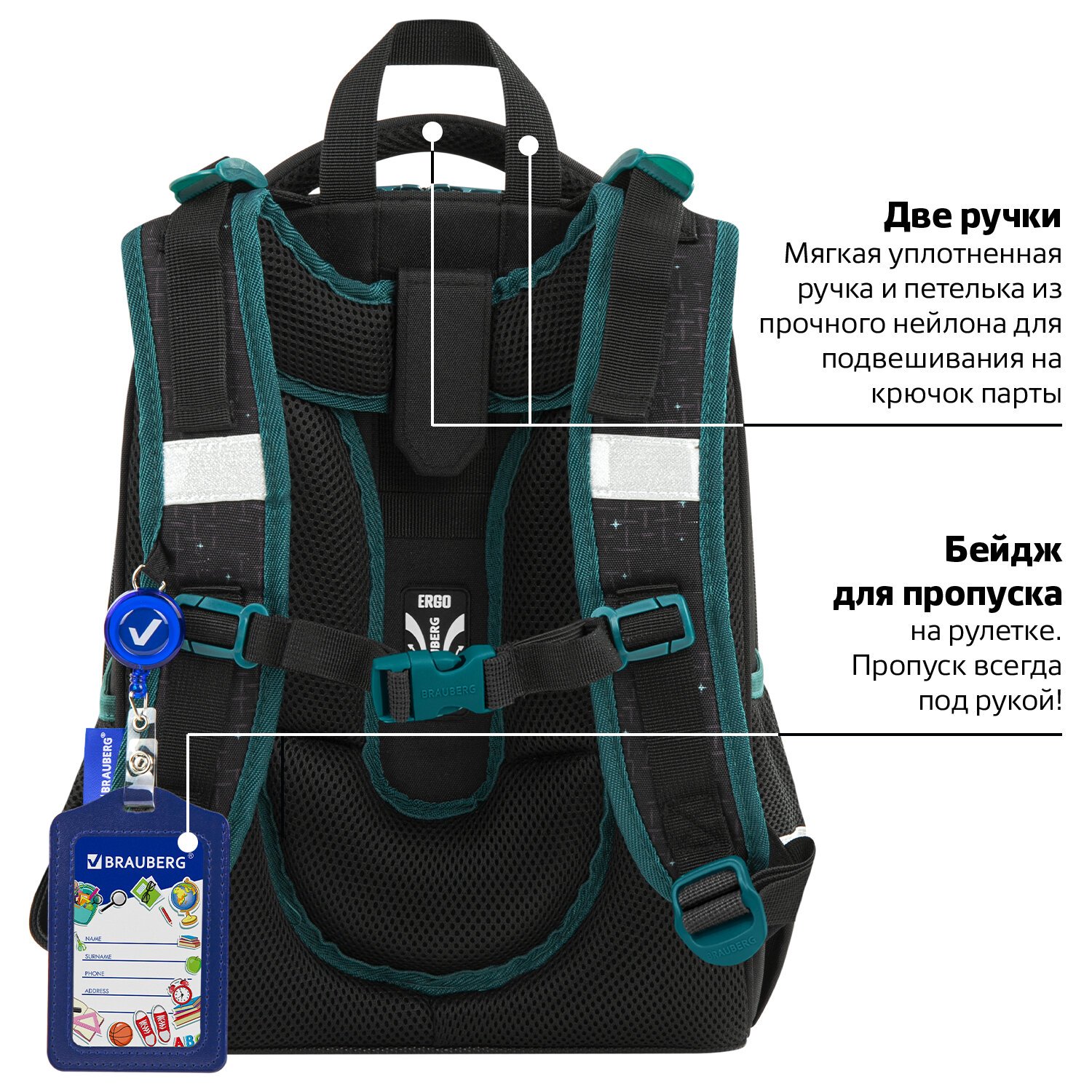 В комплекте с ранцем поставляется бейдж для пропуска на рулетке. Для его надёжной фиксации на одной из лямок ранца имеется специальное металлическое кольцо. Это очень удобно и экономит массу времени – ребенок просто прикладывает пропуск к турникету, вытягивая его на нужное расстояние, а затем рулетка автоматически возвращается обратно. Пропуск всегда под рукой!