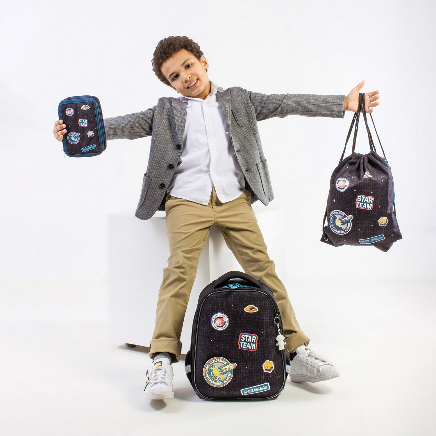 Уникальность данного ранца заключается в использовании светодиодных лампочек в дизайне. Легкий щелчок по передней панели ранца и загораются яркие огоньки, похожие на звезды в ночном небе. Светодиодные лампочки дополнены тематическими аппликациями, которые продолжают тему звездного неба и космоса.