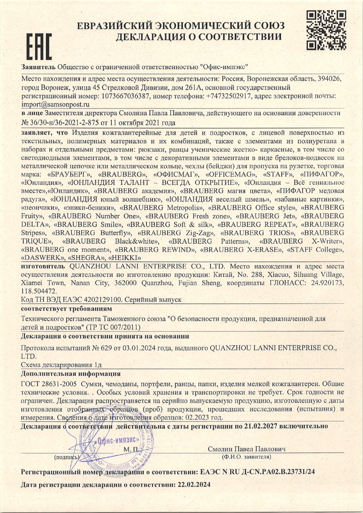 Ранцы BRAUBERG PREMIUM протестированы НИИ гигиены и охраны здоровья детей и подростков ФГАУ "Национальный медицинский исследовательский центр здоровья детей". В рамках проведенных исследований* было установлено, что конструкции и материалы ученических ранцев соответствуют современным эргономическим требованиям и способствуют формированию здоровой осанки у школьников.