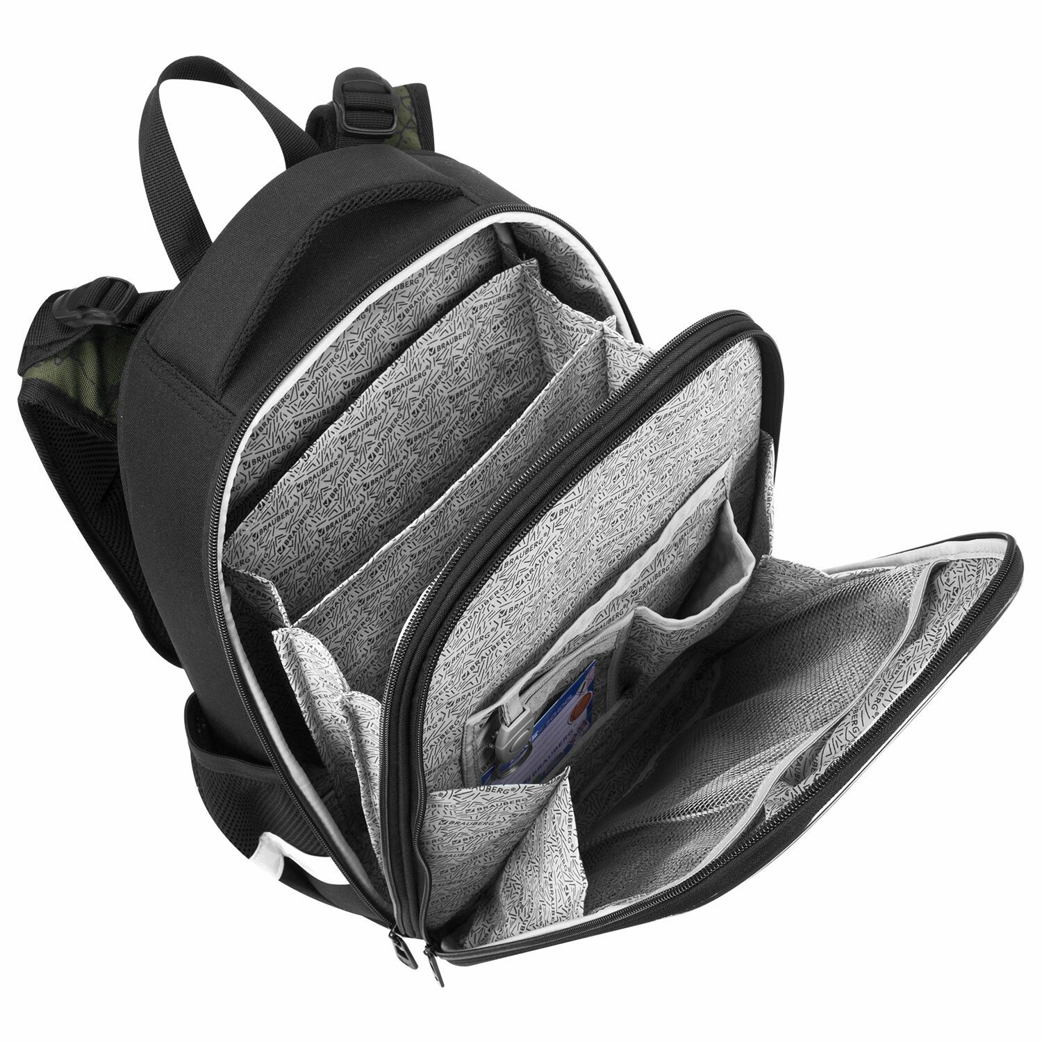 В основном отделении ранца можно легко и быстро разместить учебники и тетради между двумя плотными перегородками. Внутри фронтального отделения находится органайзер для канцтоваров, именная карточка, карман для телефона, съёмный карабин для ключей и большое отделение из сетки. Такая организация пространства поможет держать принадлежности в сохранности и приучить ребенка к порядку. Ранец широко раскрывается, повышая удобство использования, а за счёт боковых перегородок содержимое не выскользнет из ранца.