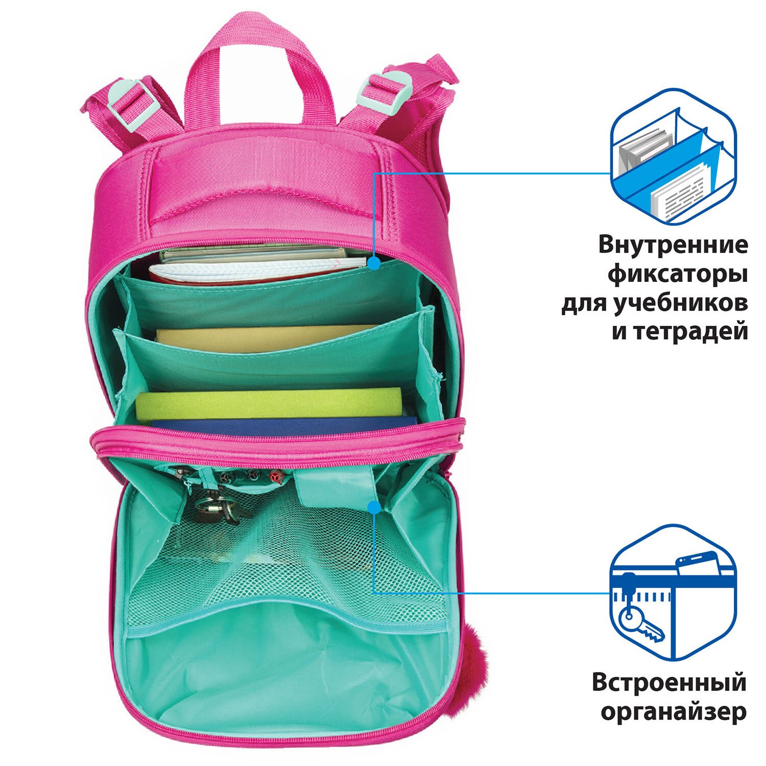 В основном отделении ранца можно легко и быстро разместить учебники и тетради между двумя плотными перегородками. Внутри фронтального отделения находится органайзер для канцтоваров, карман для телефона, карабин для ключей и большое отделение из сетки.Такая организация пространства поможет держать принадлежности в сохранности и приучить ребенка к порядку.