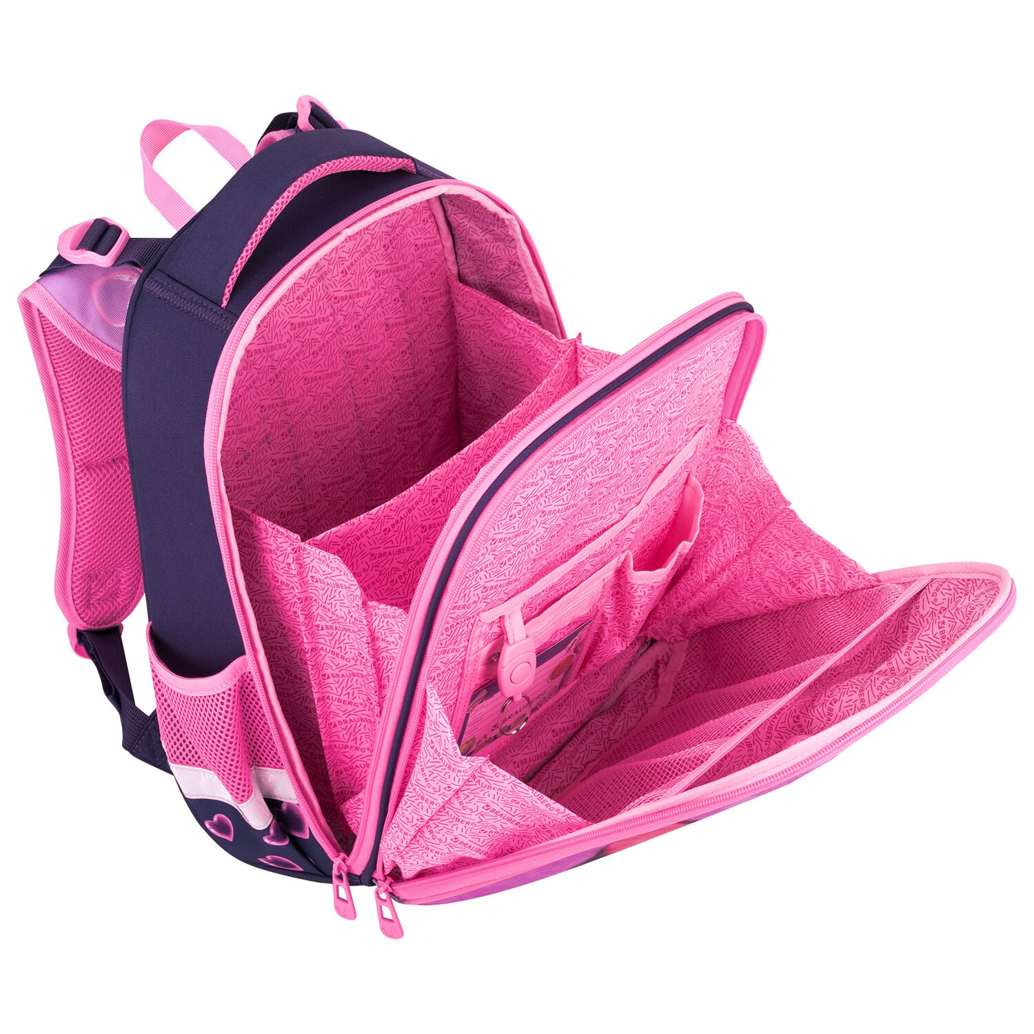 В основном отделении ранца можно легко и быстро разместить учебники и тетради. Внутри фронтального отделения находится органайзер для канцелярских принадлежностей, именная карточка, карман для телефона, съёмный карабин для ключей и большое отделение из сетки. Такая организация пространства поможет сохранить принадлежности в порядке и приучить ребенка к аккуратности. Ранец широко раскрывается, что повышает удобство использования, а за счёт боковых перегородок содержимое не выскользнет из ранца.