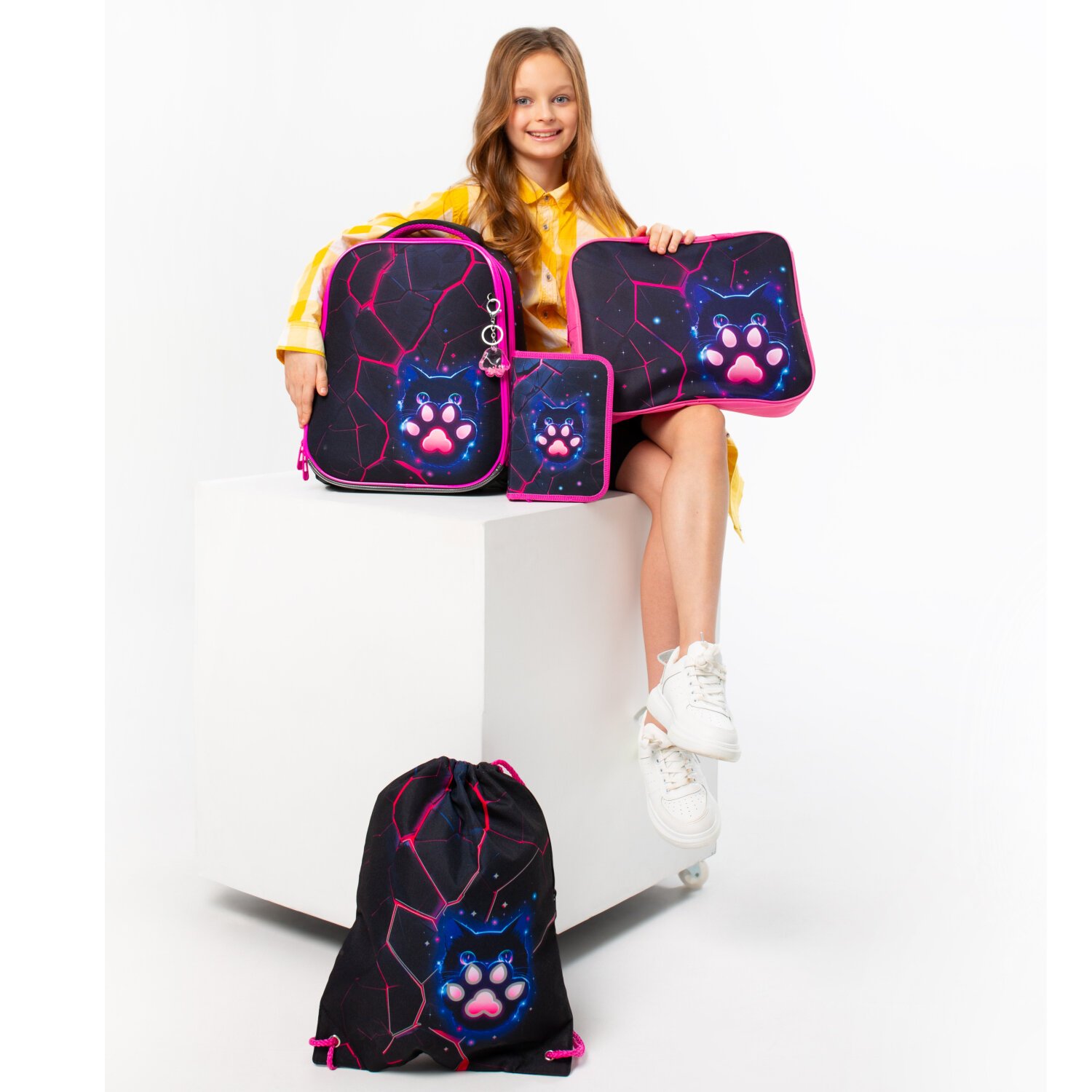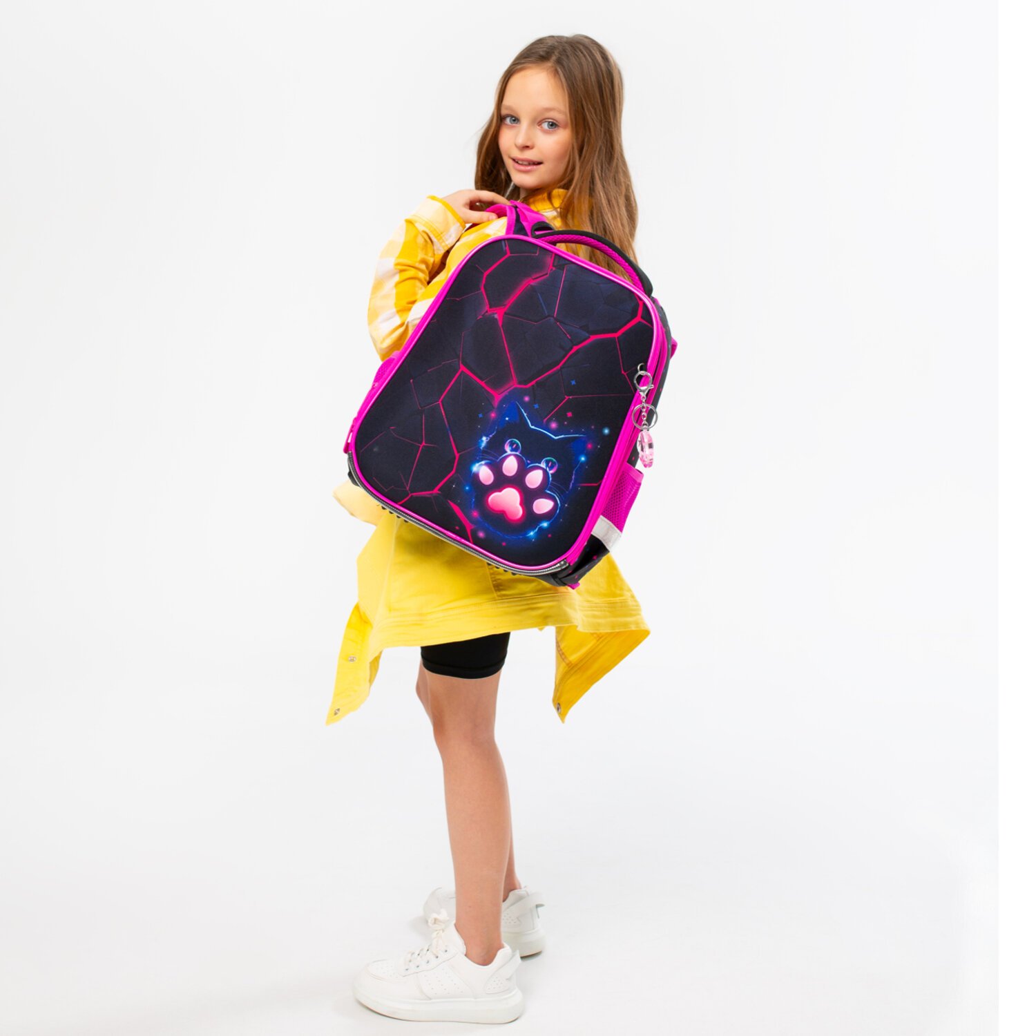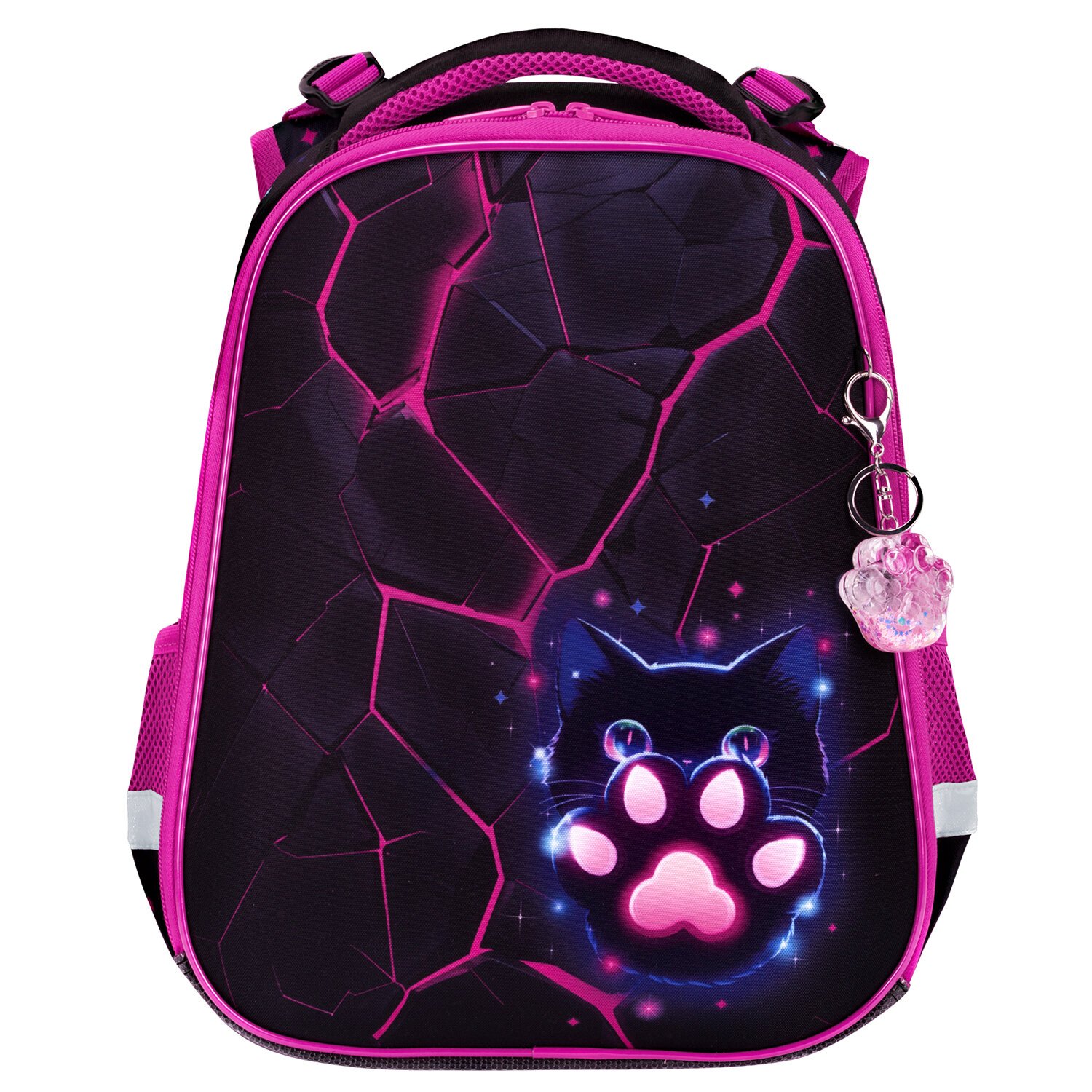 Рисунок на передней панели ранца выполнен с применением ярких контрастных цветов, а брелок-подвеска в форме таба-лапки дополняет дизайн ранца.