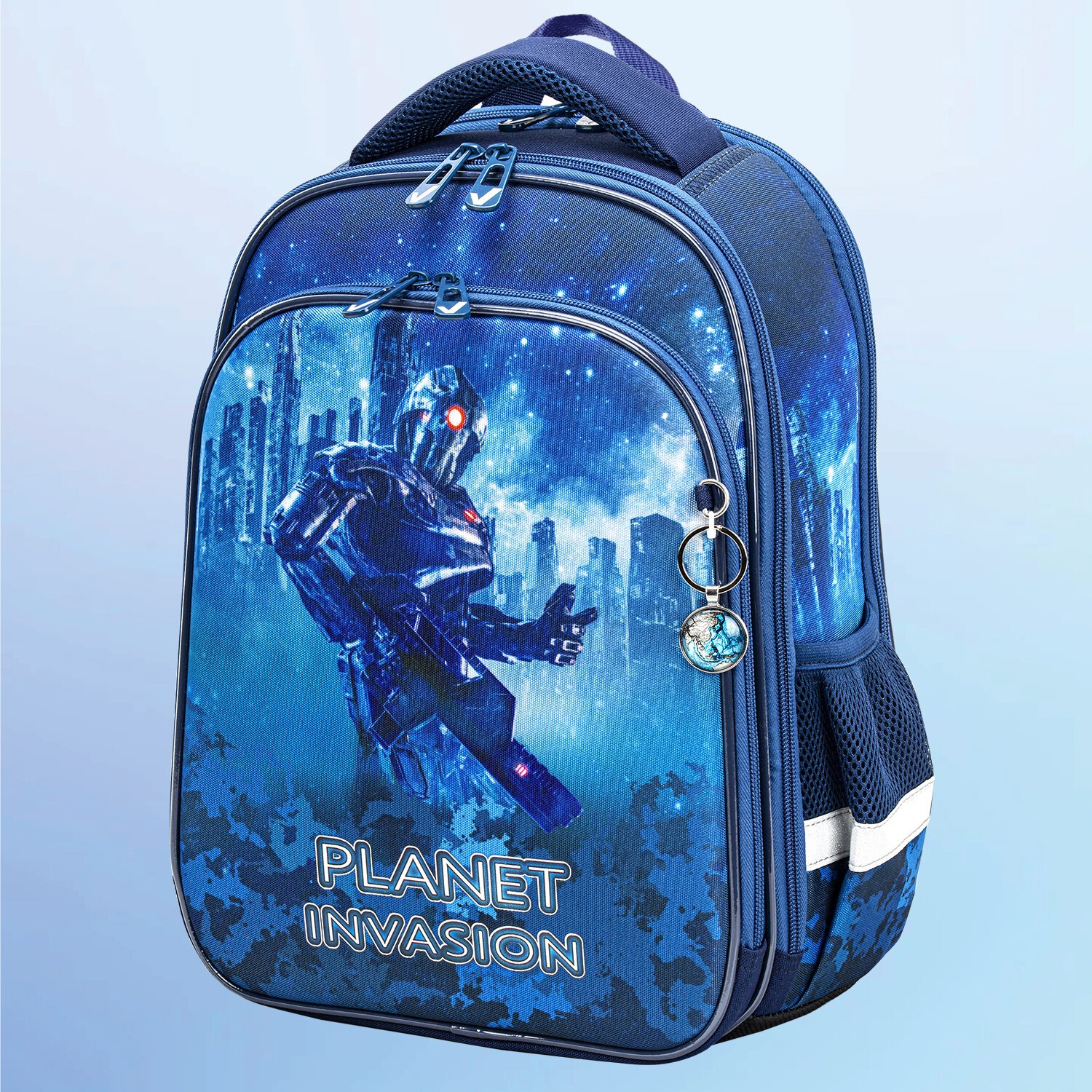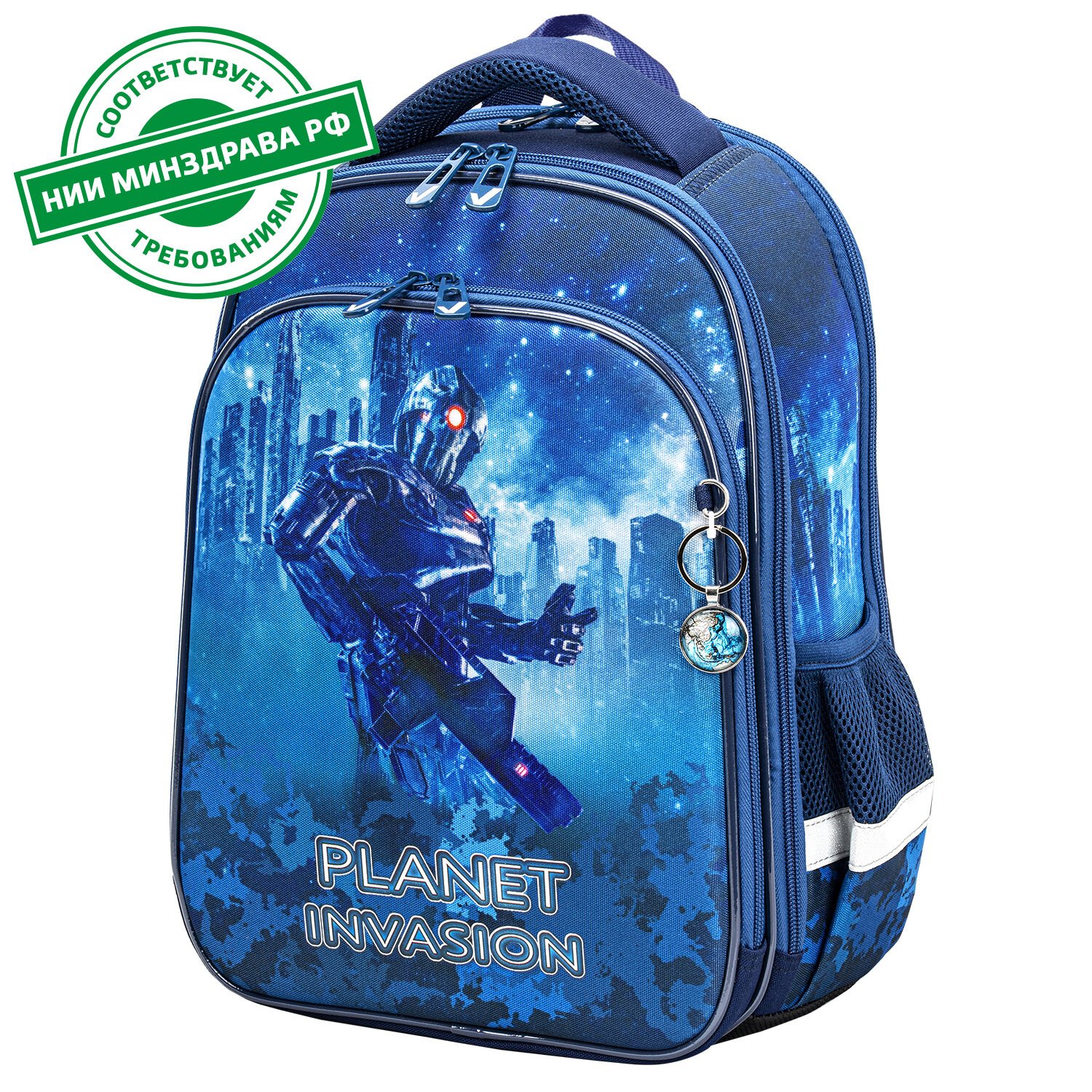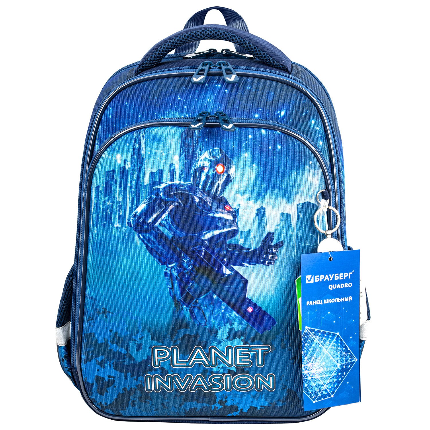 Ранец BRAUBERG QUADRO, 3 отделения, с брелком, "Planet invasion", 37х28х18 см, 270604