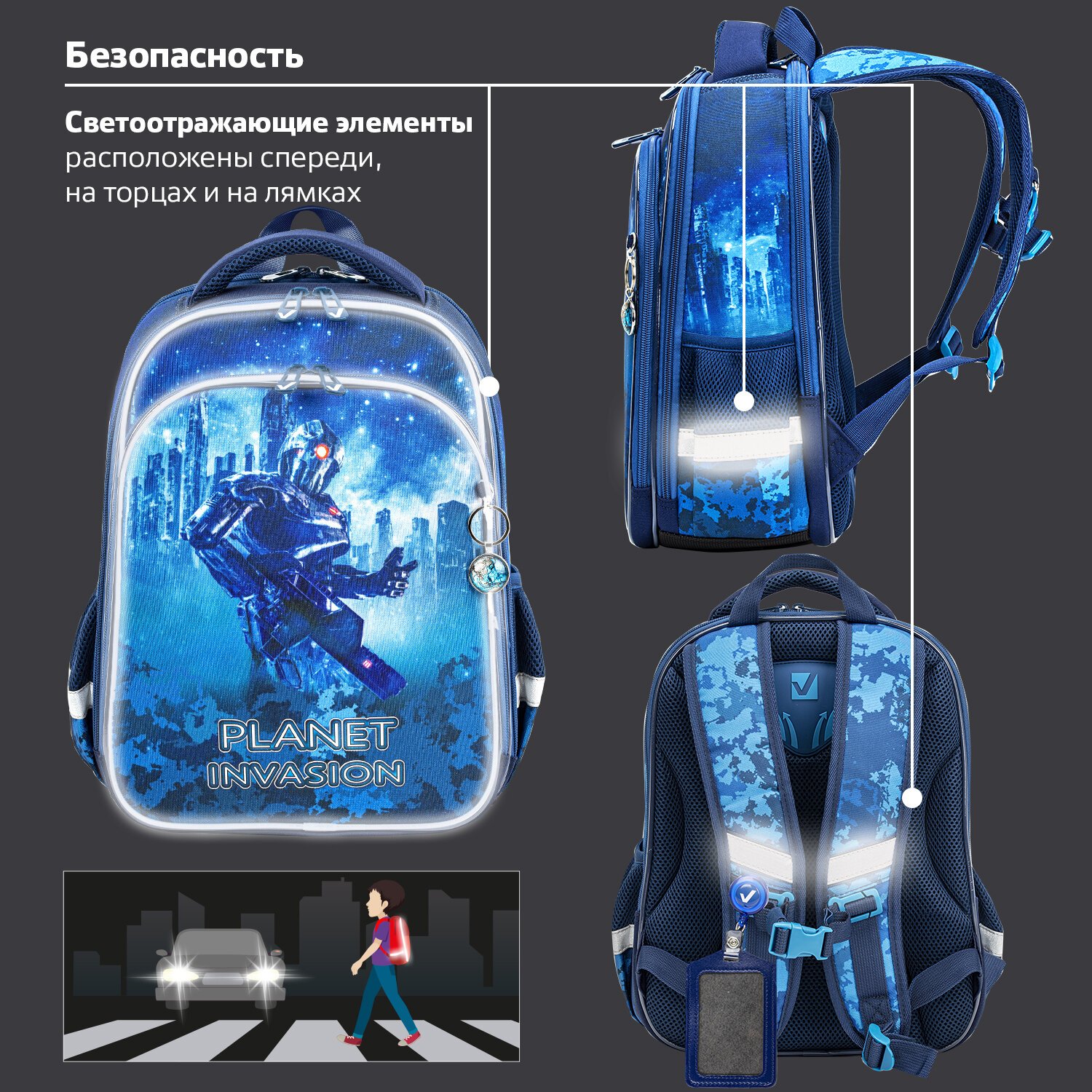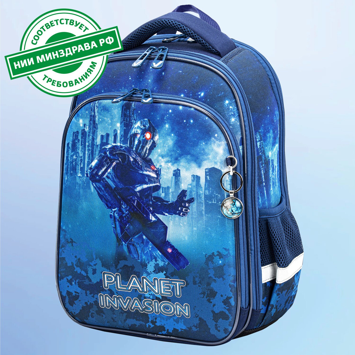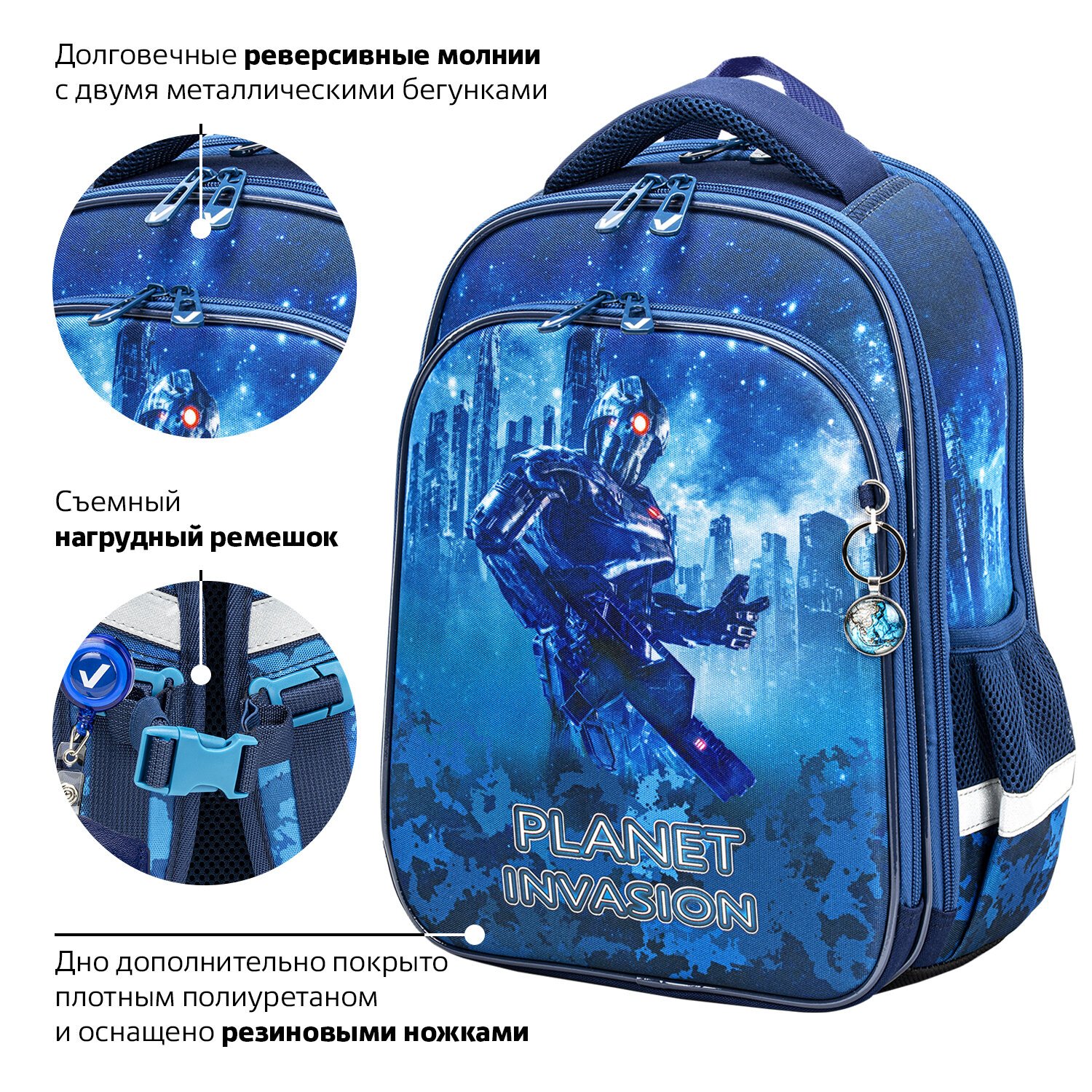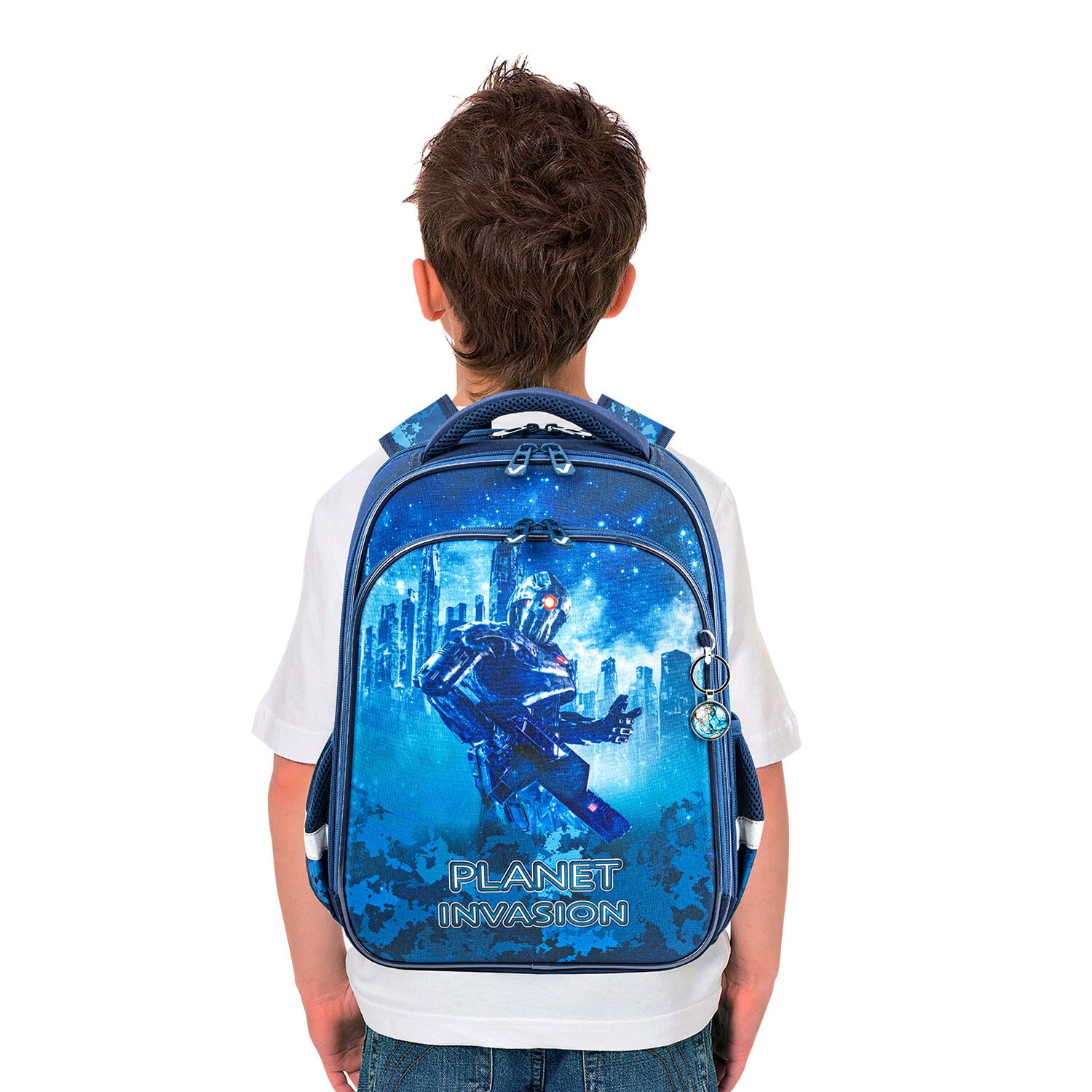 Ранец BRAUBERG QUADRO, 3 отделения, с брелком, "Planet invasion", 37х28х18 см, 270604