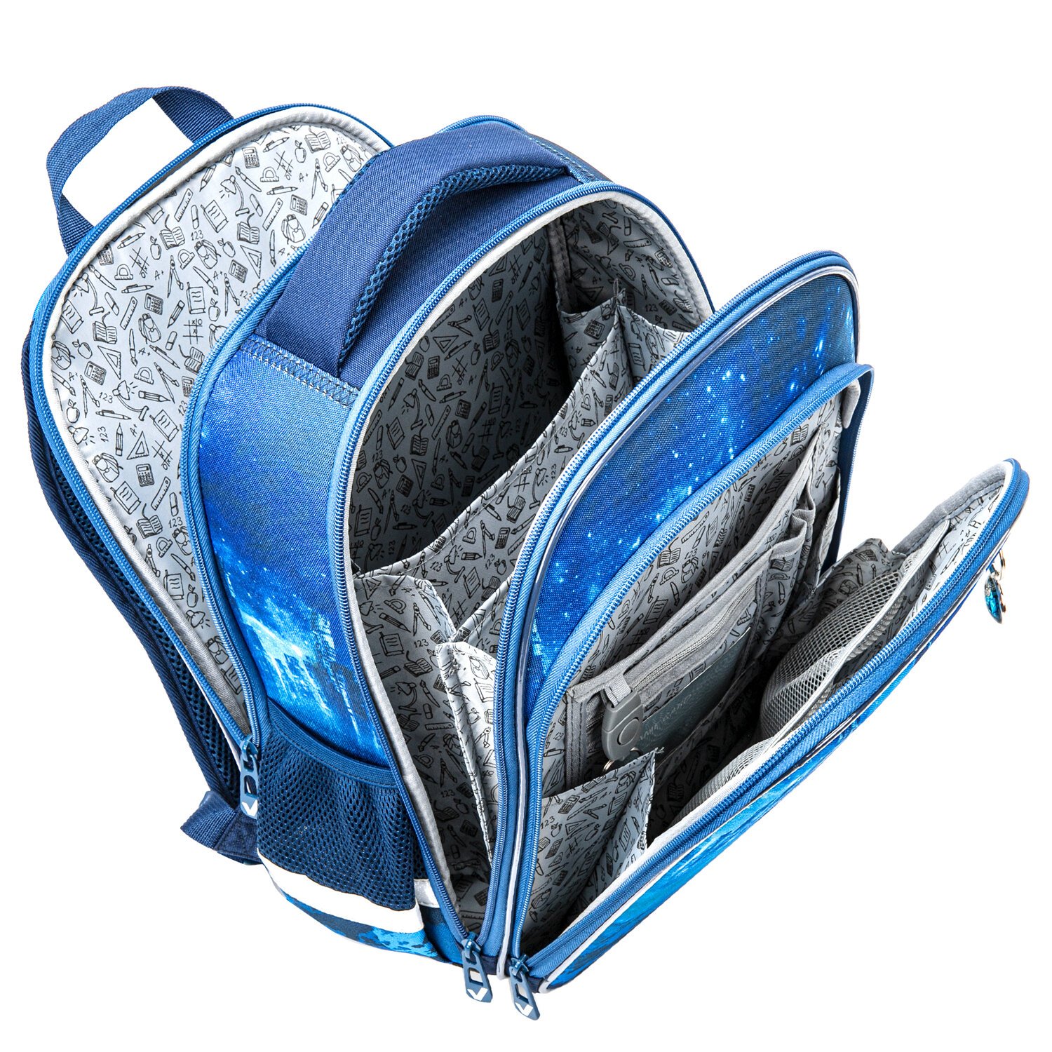 В основном отделении ранца можно легко и быстро разместить учебники и тетради между двумя плотными перегородками. Внутри фронтального отделения находится органайзер для канцтоваров, именная карточка, карман для телефона, карабин для ключей. Такая организация пространства поможет держать принадлежности в сохранности и приучить ребенка к порядку. Ранец широко раскрывается, повышая удобство использования, а за счёт боковых перегородок содержимое не выскользнет из ранца.