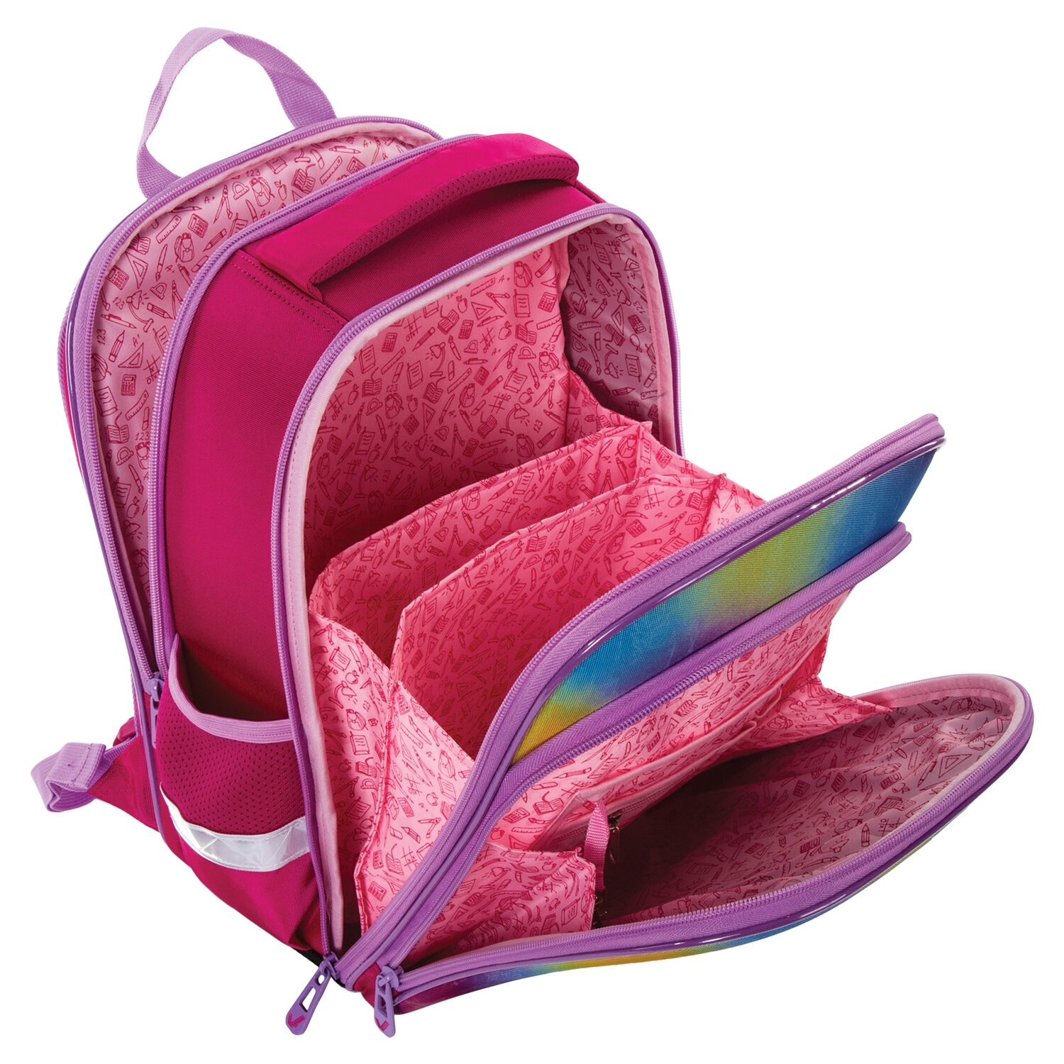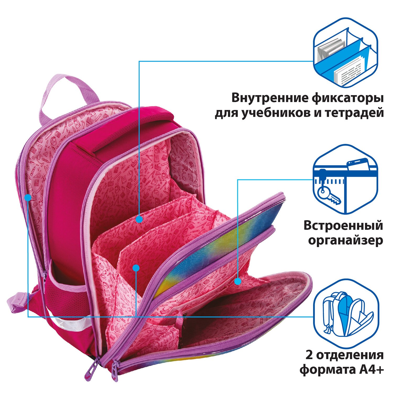 В основном отделении ранца можно легко и быстро разместить учебники и тетради между двумя плотными перегородками. Внутри фронтального отделения находится органайзер для канцтоваров, именная карточка, карман для телефона, карабин для ключей. Такая организация пространства поможет держать принадлежности в сохранности и приучить ребенка к порядку. Ранец широко раскрывается, повышая удобство использования, а благодаря боковым перегородкам содержимое не выскользнет из ранца.