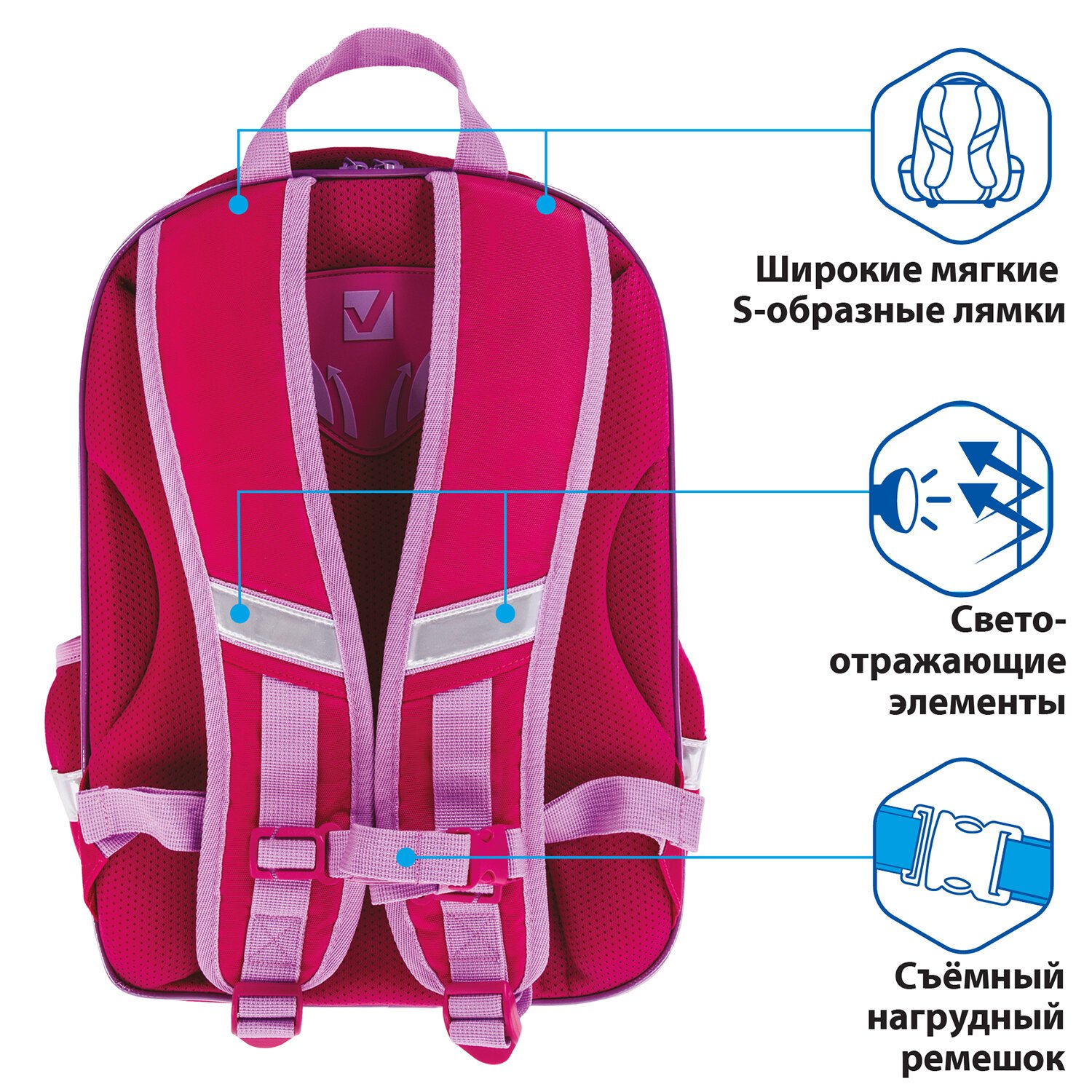 Удобная мягкая вентилируемая спинка с воздушными спонжевыми панелями разработана с учетом анатомических особенностей детей младшего школьного возраста. При правильной регулировке ранец практически не будет ощущаться на плечах и не будет доставлять дискомфорт при носке. В процессе эксплуатации равномерное распределение нагрузки позволит сохранить правильную осанку!