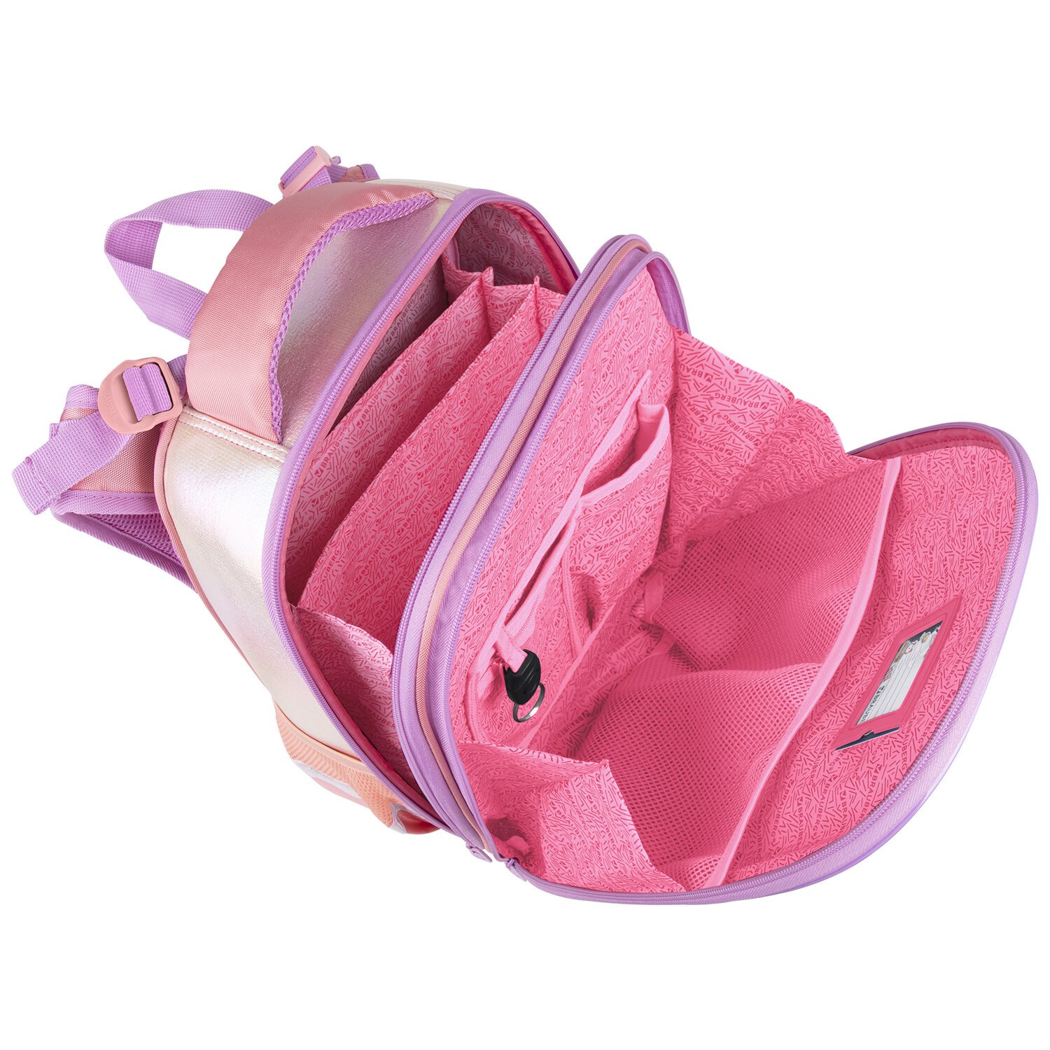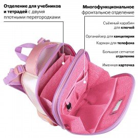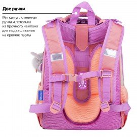 Передняя панель ранца выполнена из перламутровой экокожи, которая будет красиво переливаться на солнце. А мягкий и приятный на ощупь брелок-подвеска служит дополнительным украшением ранца.