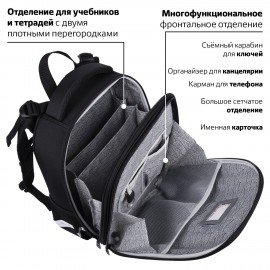 В основном отделении ранца можно легко и быстро разместить учебники и тетради. Внутри фронтального отделения находится органайзер для канцтоваров, именная карточка, карман для телефона, съёмный карабин для ключей и большое отделение из сетки. Такая организация пространства поможет держать принадлежности в сохранности и приучить ребенка к порядку. Ранец широко раскрывается, повышая удобство использования, а за счёт боковых перегородок содержимое не выскользнет из ранца.