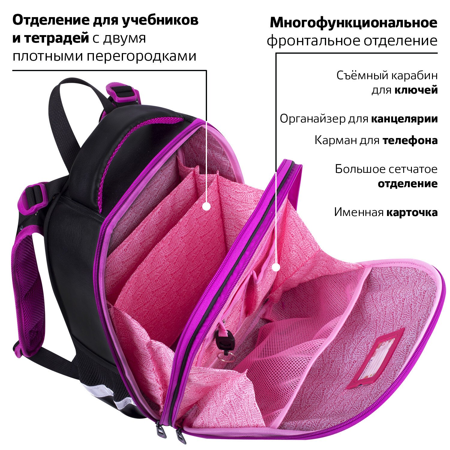 В основном отделении ранца можно легко и быстро разместить учебники и тетради. Внутри фронтального отделения находится органайзер для канцтоваров, именная карточка, карман для телефона, съёмный карабин для ключей и большое отделение из сетки. Такая организация пространства поможет держать принадлежности в сохранности и приучить ребенка к порядку. Ранец широко раскрывается, повышая удобство использования, а за счёт боковых перегородок содержимое не выскользнет из ранца.