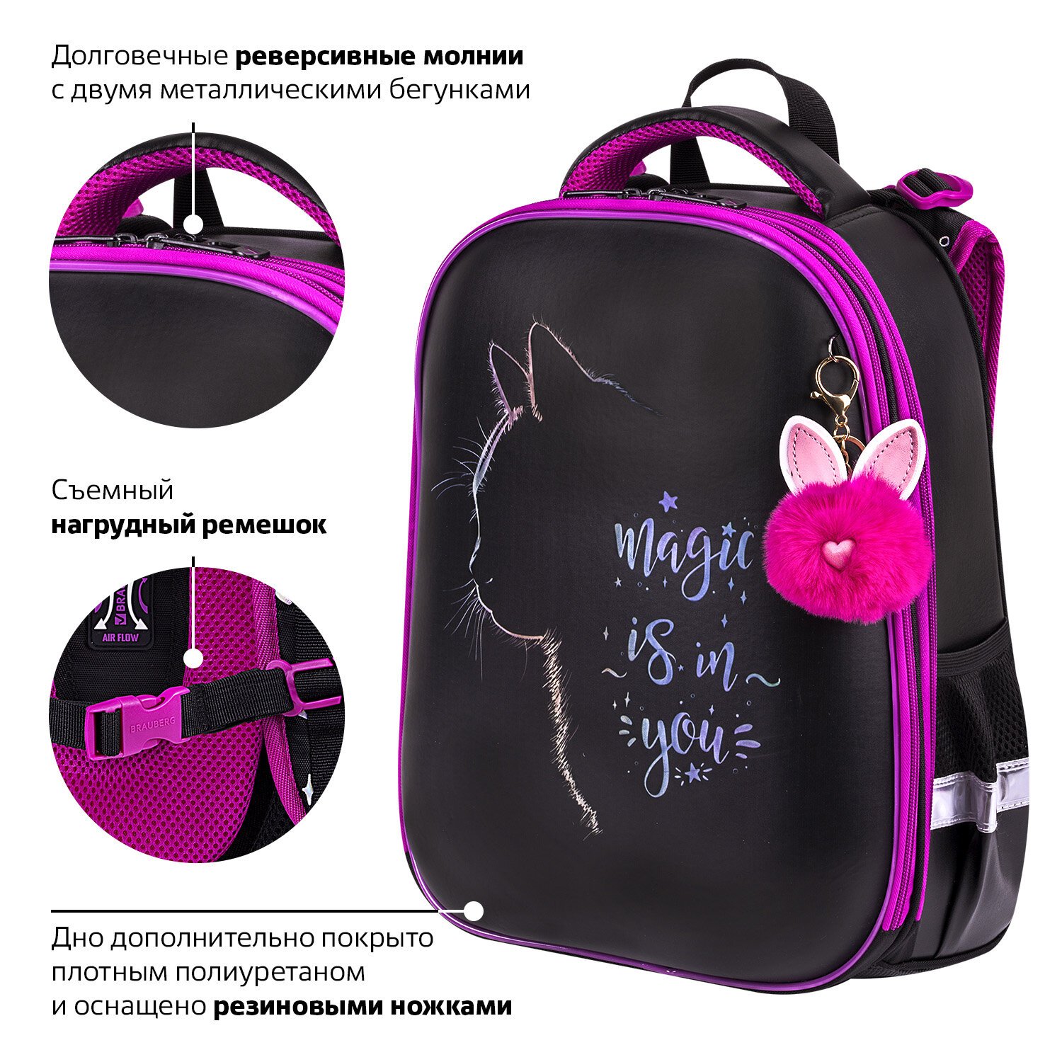 Ранец BRAUBERG SHINY, 2 отделения, с брелоком, "Magic cat", 38х28х14 см, 271381