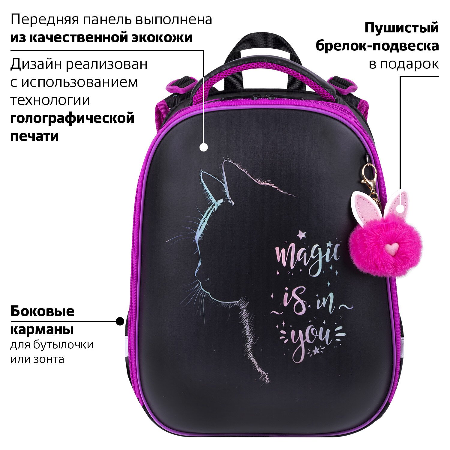 Передняя панель ранца выполнена из высококачественной экокожи. Дизайн на передней панели реализован с использованием технологии голографической печати. А мягкий и приятный на ощупь брелок-подвеска служит дополнительным украшением ранца.