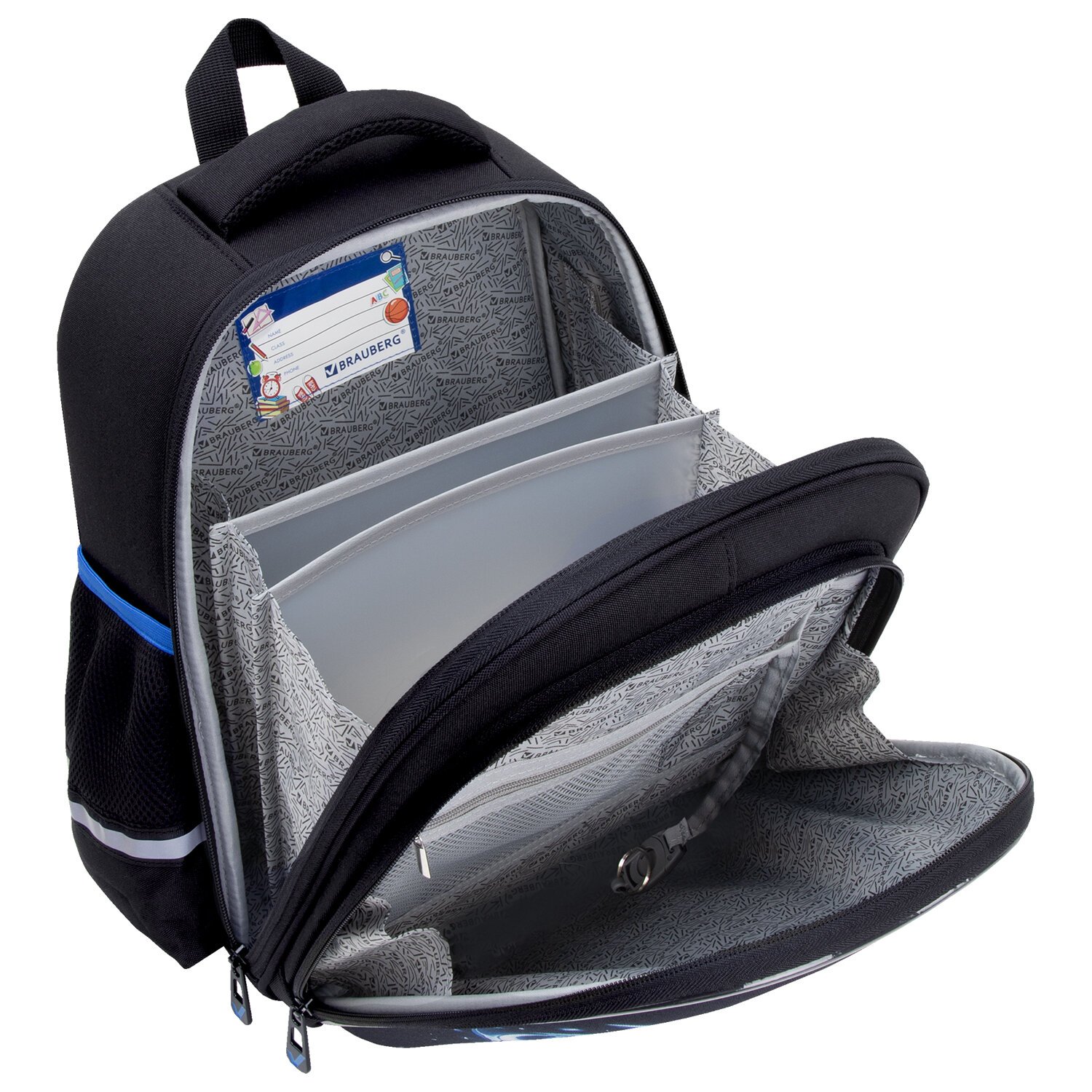 В основном отделении ранца можно легко и быстро разместить учебники и тетради. Внутри фронтального отделения находится органайзер для канцтоваров, карман для телефона и съёмный карабин для ключей. Такая организация пространства поможет держать принадлежности в сохранности и приучить ребенка к порядку. Ранец широко раскрывается, повышая удобство использования, а за счёт боковых перегородок содержимое не выскользнет из ранца.