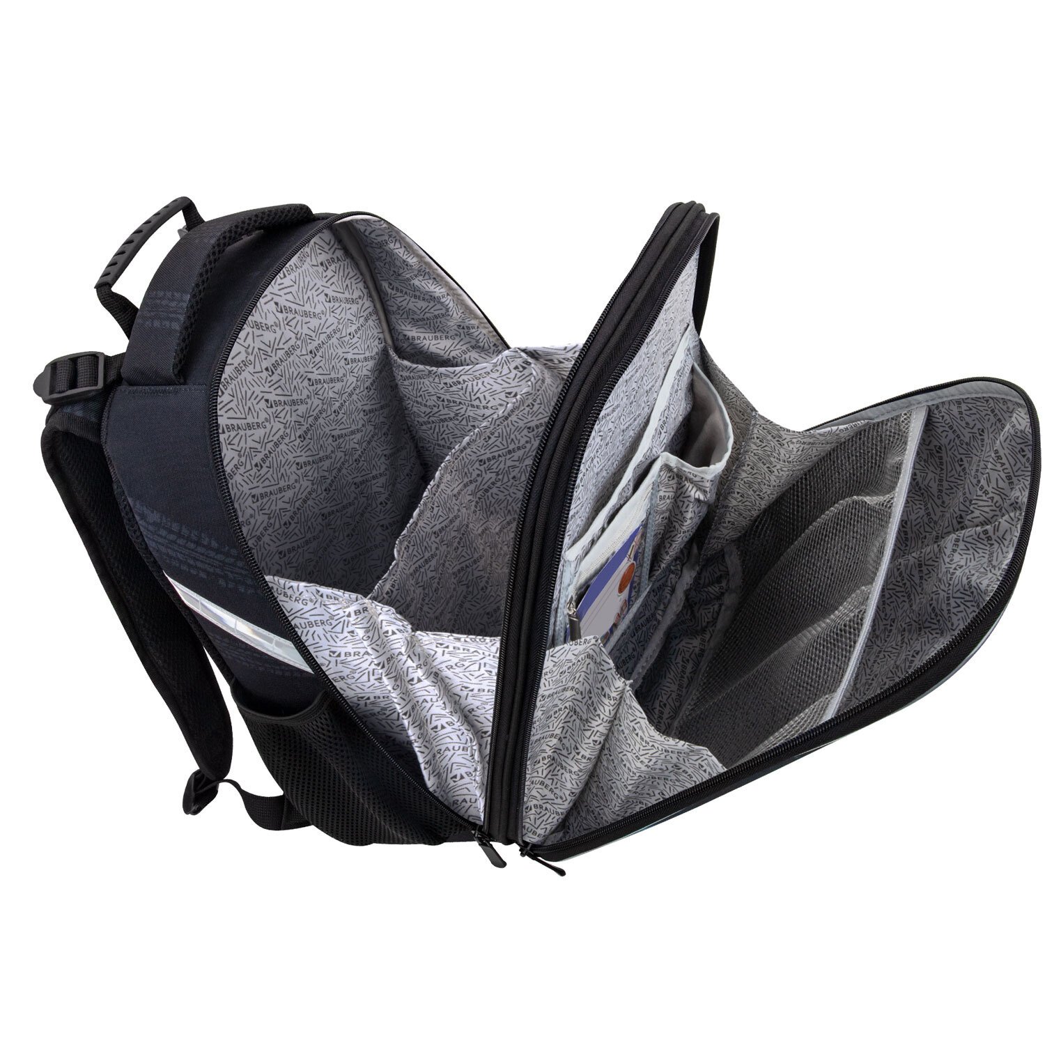 В основном отделении ранца можно легко и быстро разместить учебники и тетради. Внутри фронтального отделения находится органайзер для канцтоваров, именная карточка, карман для телефона и большое отделение из сетки. Такая организация пространства поможет держать принадлежности в сохранности и приучить ребенка к порядку. Ранец широко раскрывается, повышая удобство использования, а благодаря боковым перегородкам содержимое не выскользнет из ранца.