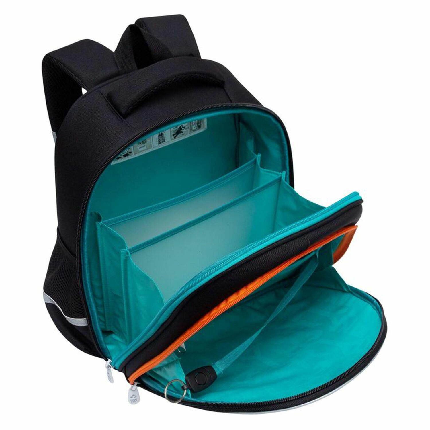 Основное отделение разбито на три отсека: для книг, тетрадей и папок А4. В дополнительное помещается сменка (есть три кармашка для мелочей). В боковых можно носить воду или перекус. У рюкзака формованная лицевая часть, жесткая анатомическая спинка и жесткое дно на ножках. Содержимое надежно защищено. Такая конструкция равномерно распределяет нагрузку на спину.
