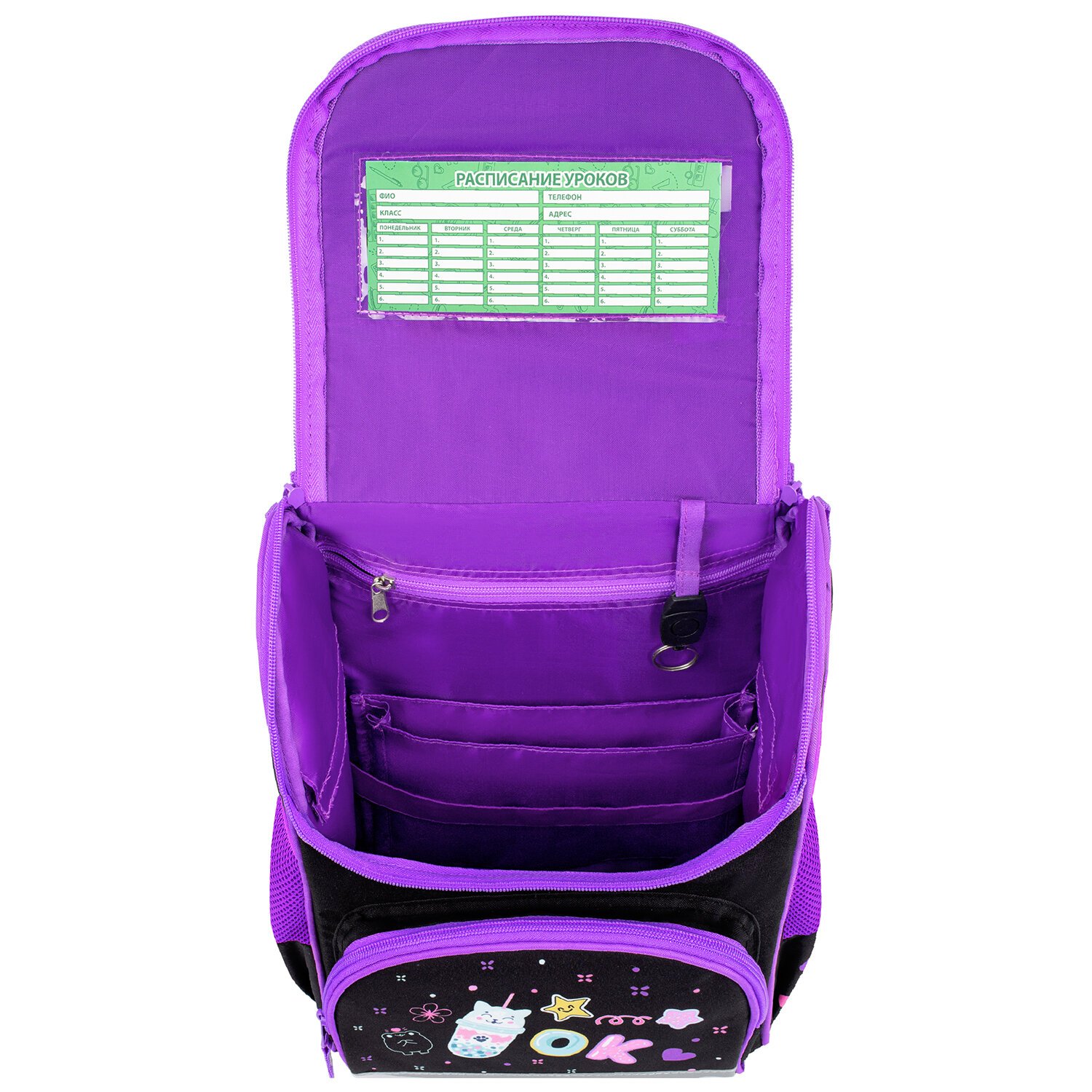 В основном отделении ранца можно легко и быстро разместить учебники и тетради, а также воспользоваться прижимными перегородками на резинке. Внутри ранца имеются карабин для ключей и вкладыш для заполнения расписания уроков на внутренней стенке крышки.
