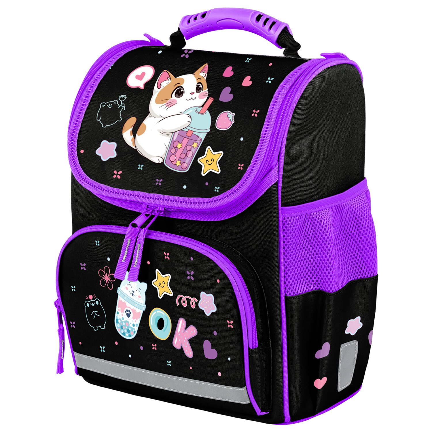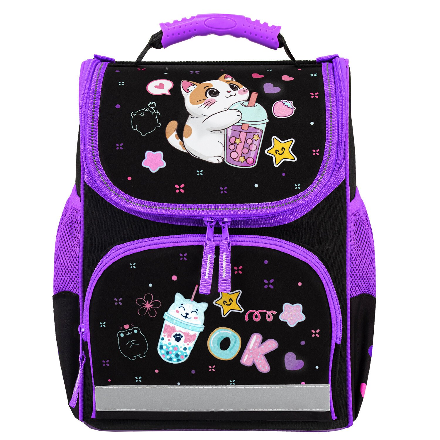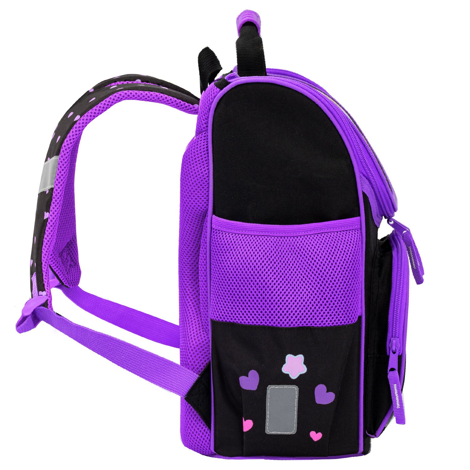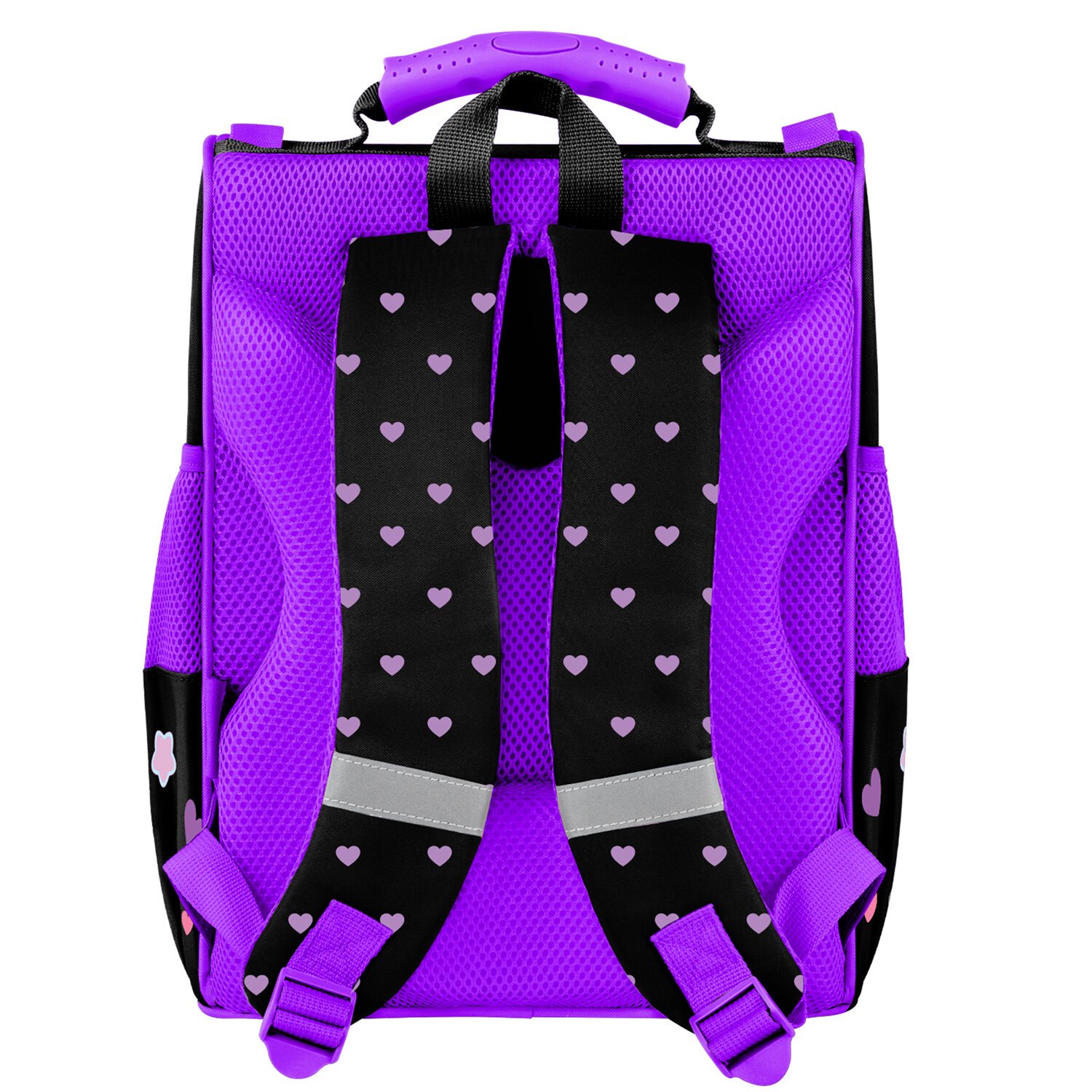 Светоотражающие элементы ранца расположены спереди на переднем кармане, на торцах и на лямках, а также дополнительно верхняя крышка прошита специальной светоотражающей лентой. Это необходимо для безопасности ребёнка в темное время суток.
