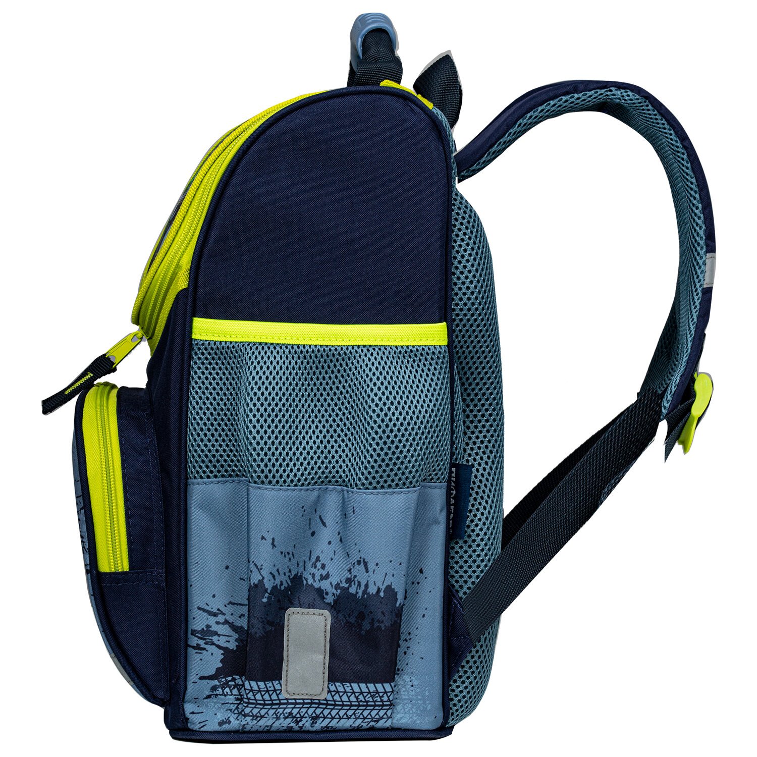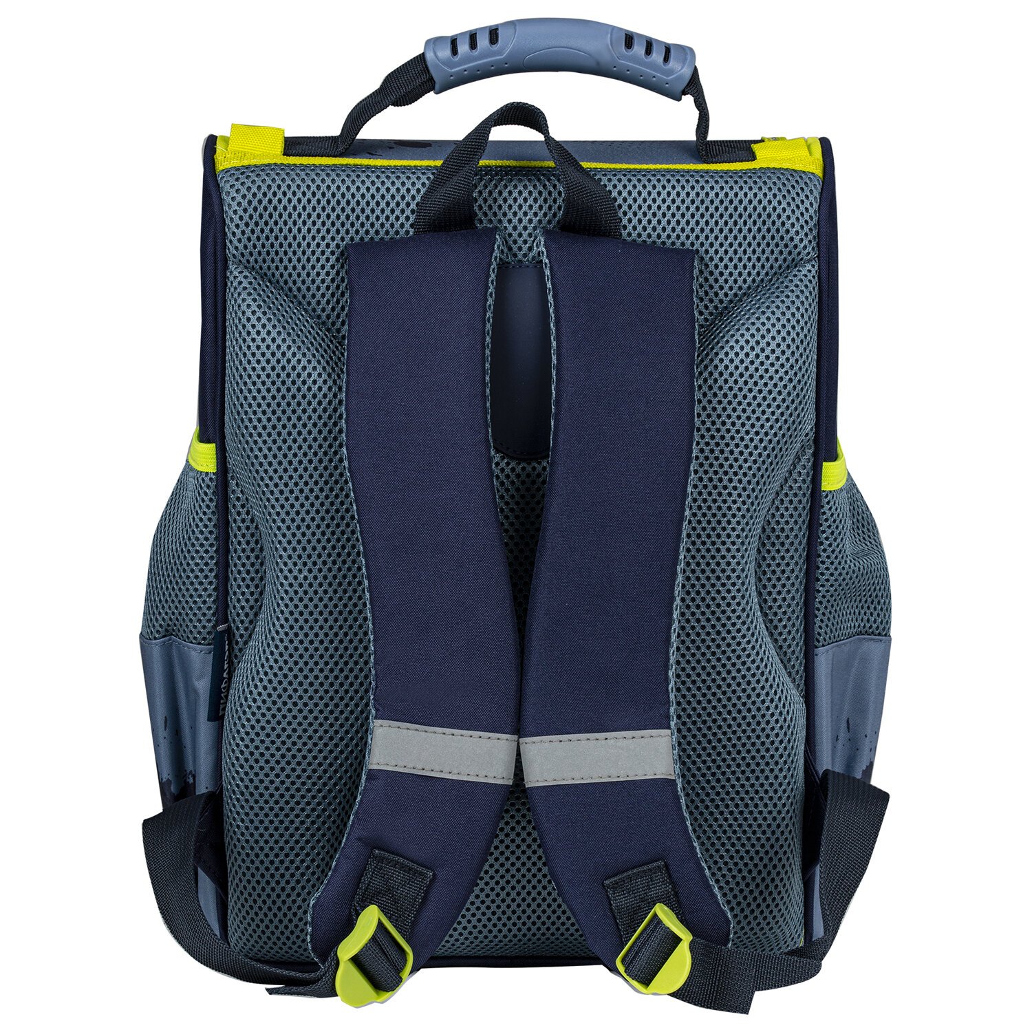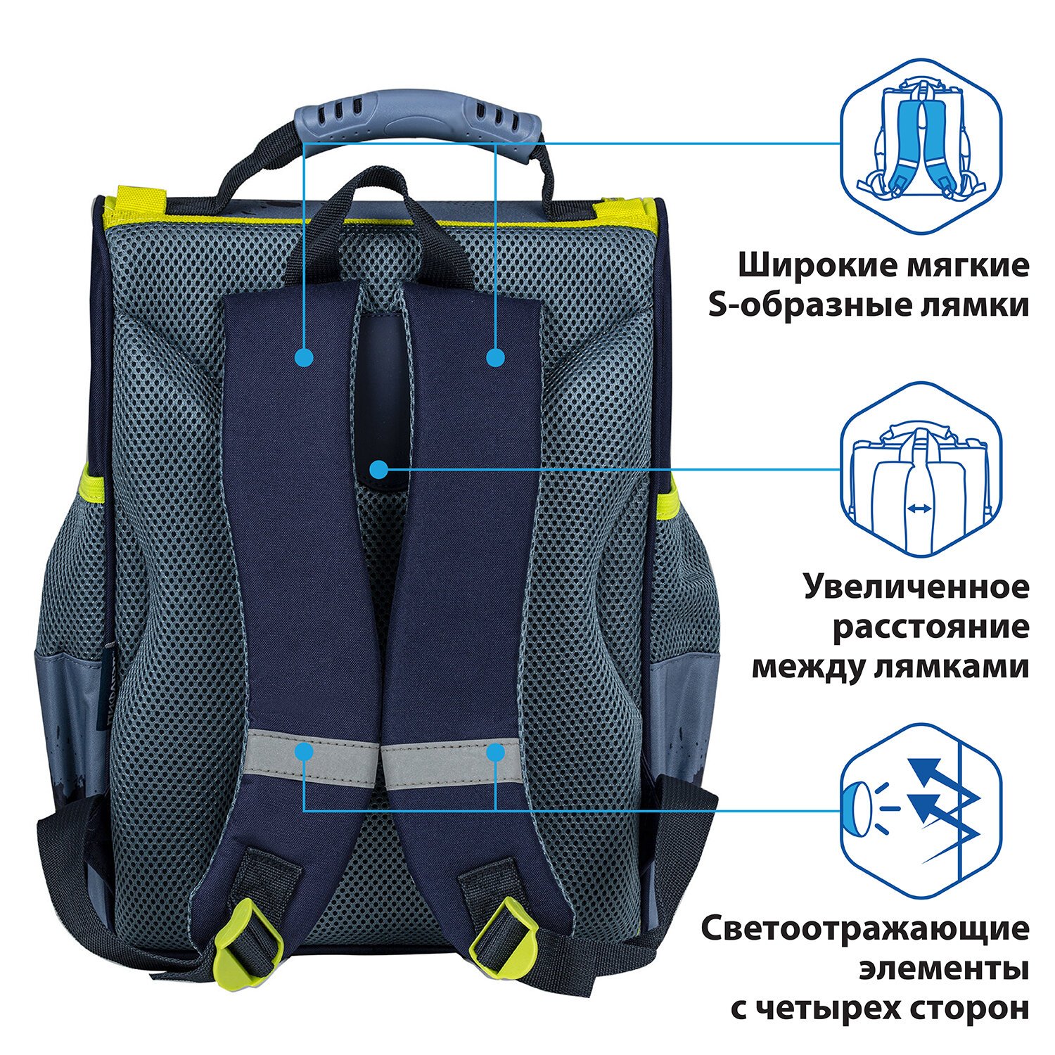 Светоотражающие элементы ранца расположены спереди на переднем кармане, на торцах и на лямках, также дополнительно верхняя крышка прошита специальной светоотражающей лентой. Это необходимо для безопасности пользователя в темное время суток.