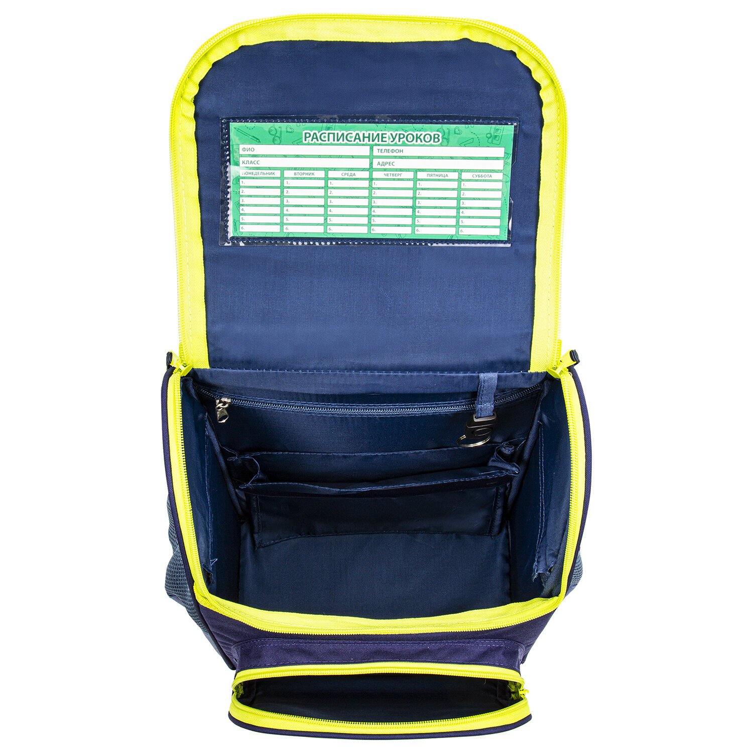 В основном отделении ранца можно легко и быстро разместить учебники и тетради, а также воспользоваться прижимными перегородками на резинке. Внутри ранца имеется карабин для ключей и вкладыш для заполнения расписания уроков на внутренней стенке крышки ранца.