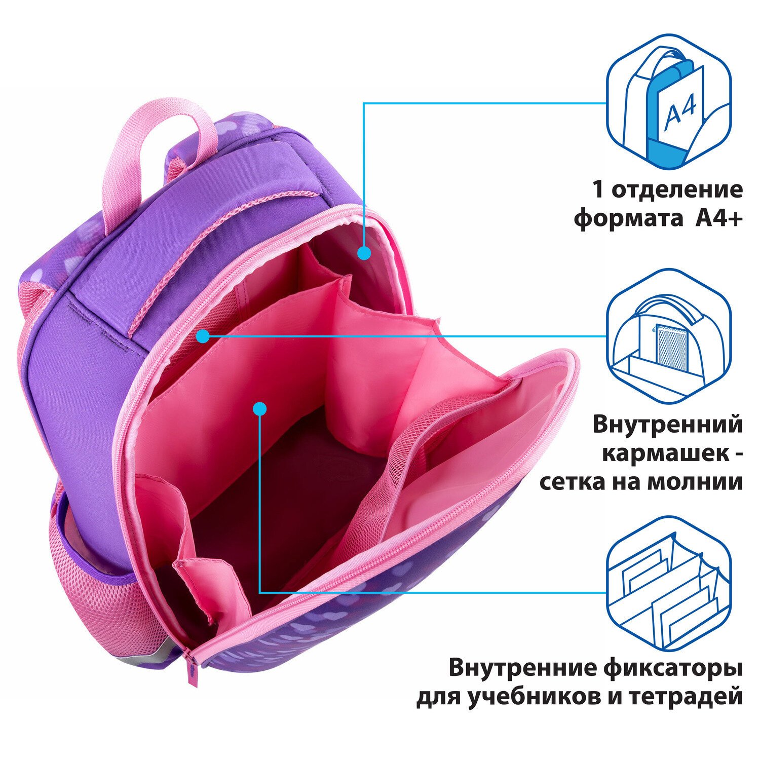 В основном отделении ранца можно легко и быстро разместить учебники и тетради, а также воспользоваться большим карманом из сетки и маленьким карманом на молнии для хранения мелочей. Такая организация пространства поможет держать принадлежности в сохранности и приучить ребенка к порядку. Ранец широко раскрывается, повышая удобство использования, а за счёт боковых перегородок содержимое не выскользнет из ранца.