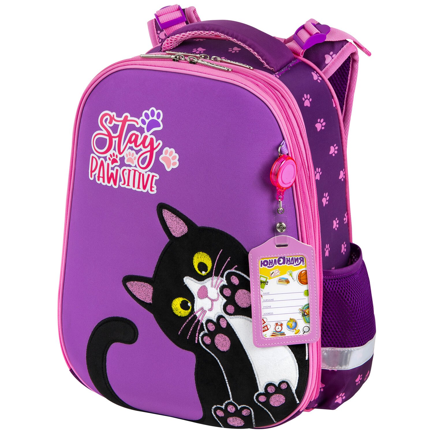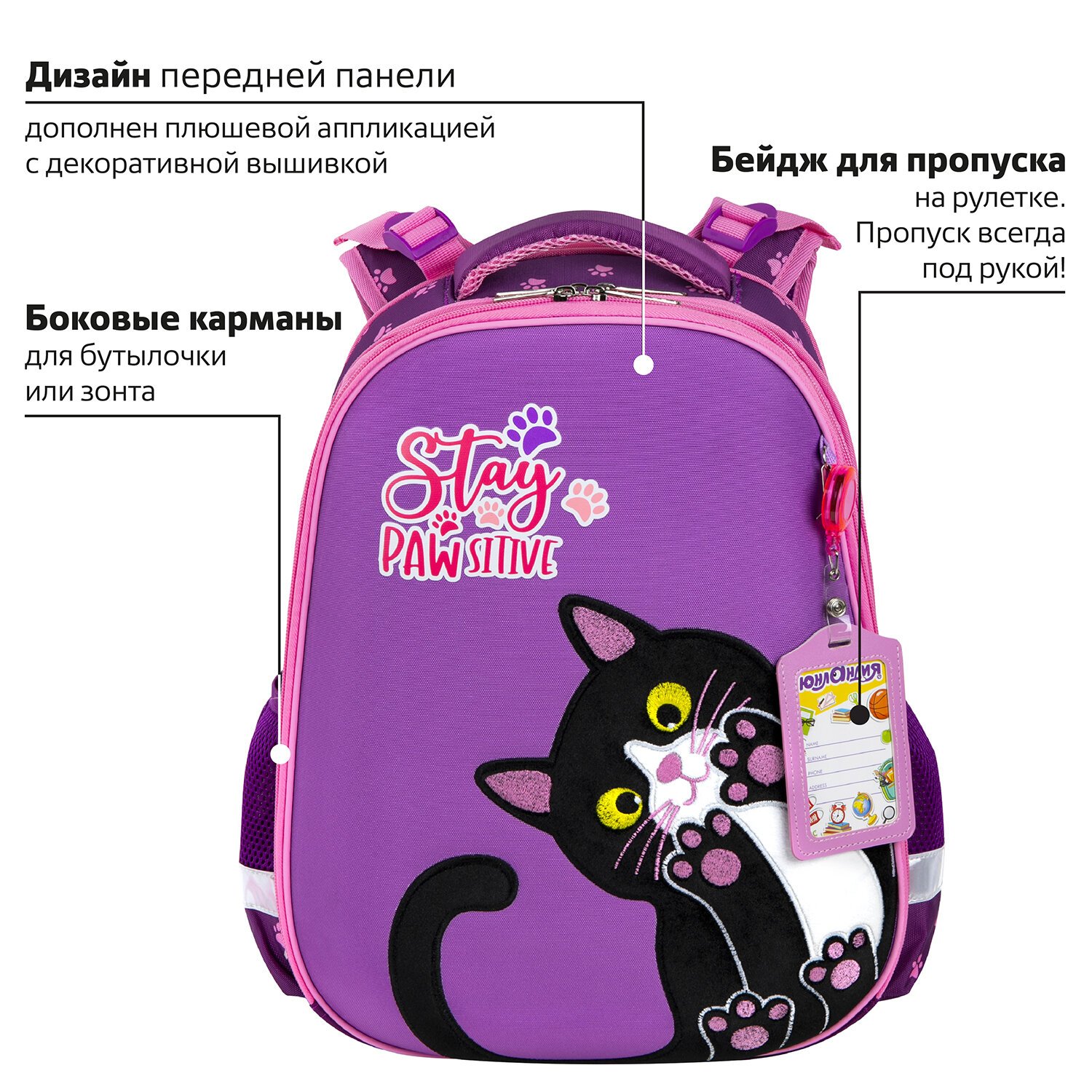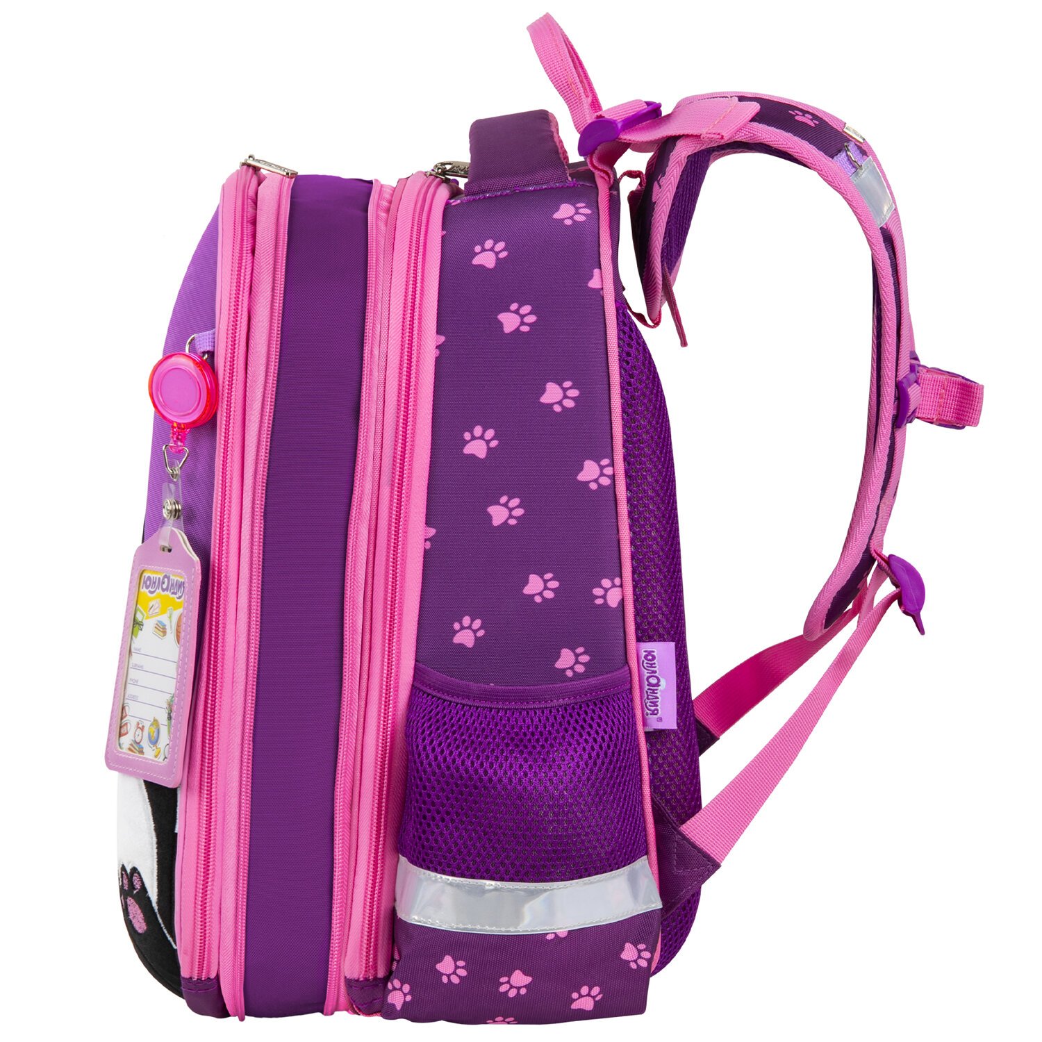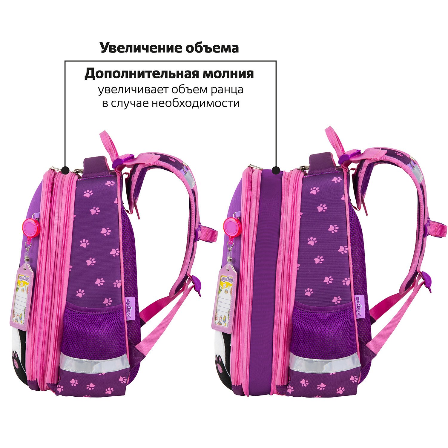 В комплекте с ранцем поставляется бейдж для пропуска на рулетке. Для его надёжной фиксации на одной из лямок ранца имеется специальное металлическое кольцо. Это очень удобно и экономит массу времени – ребенок просто прикладывает пропуск к турникету, вытягивая его на нужное расстояние, а затем рулетка автоматически возвращается обратно. Пропуск всегда под рукой!