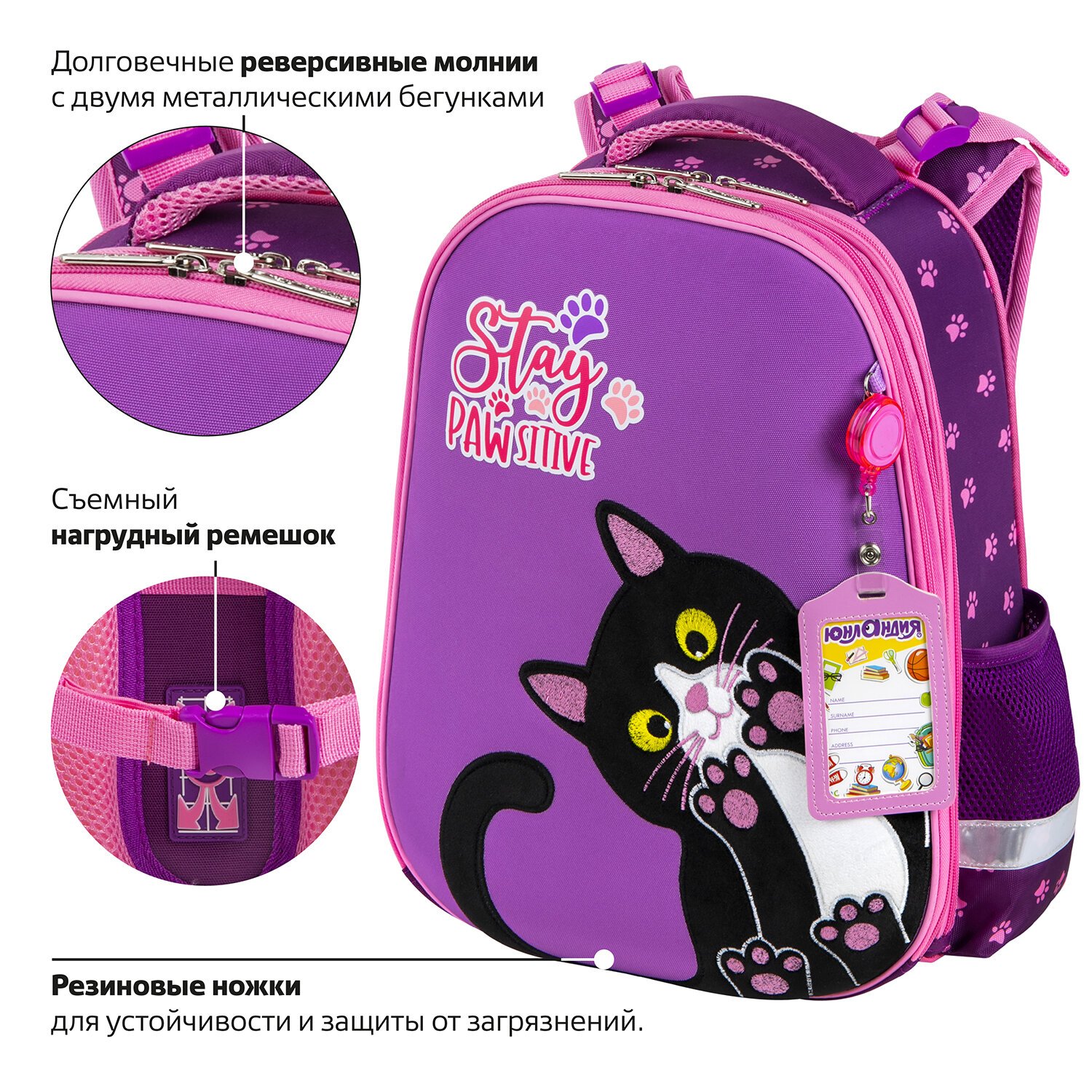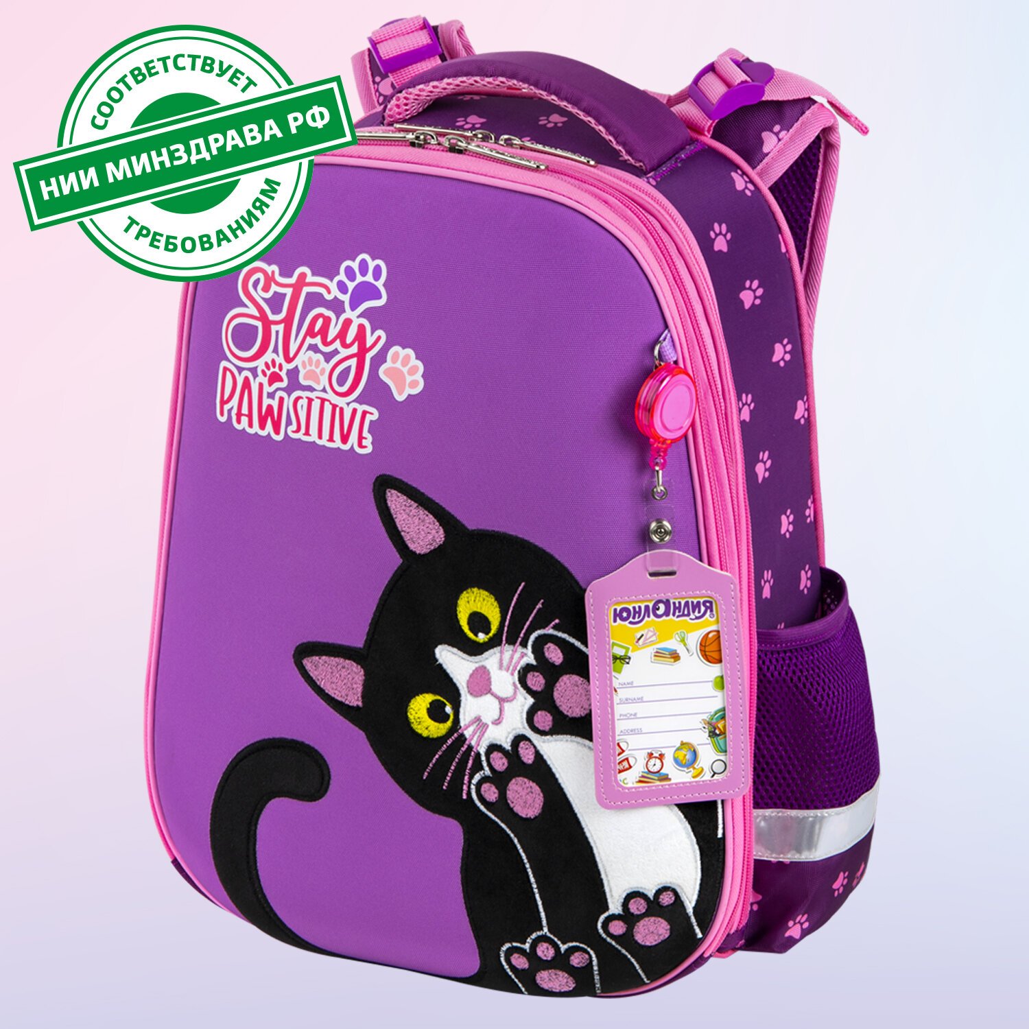 Яркая этикетка расположена на передней стороне ранца, делая его более заметным на полке магазина. Информация на ней отражает главные потребительские свойства, помогая покупателю принять решение о покупке.