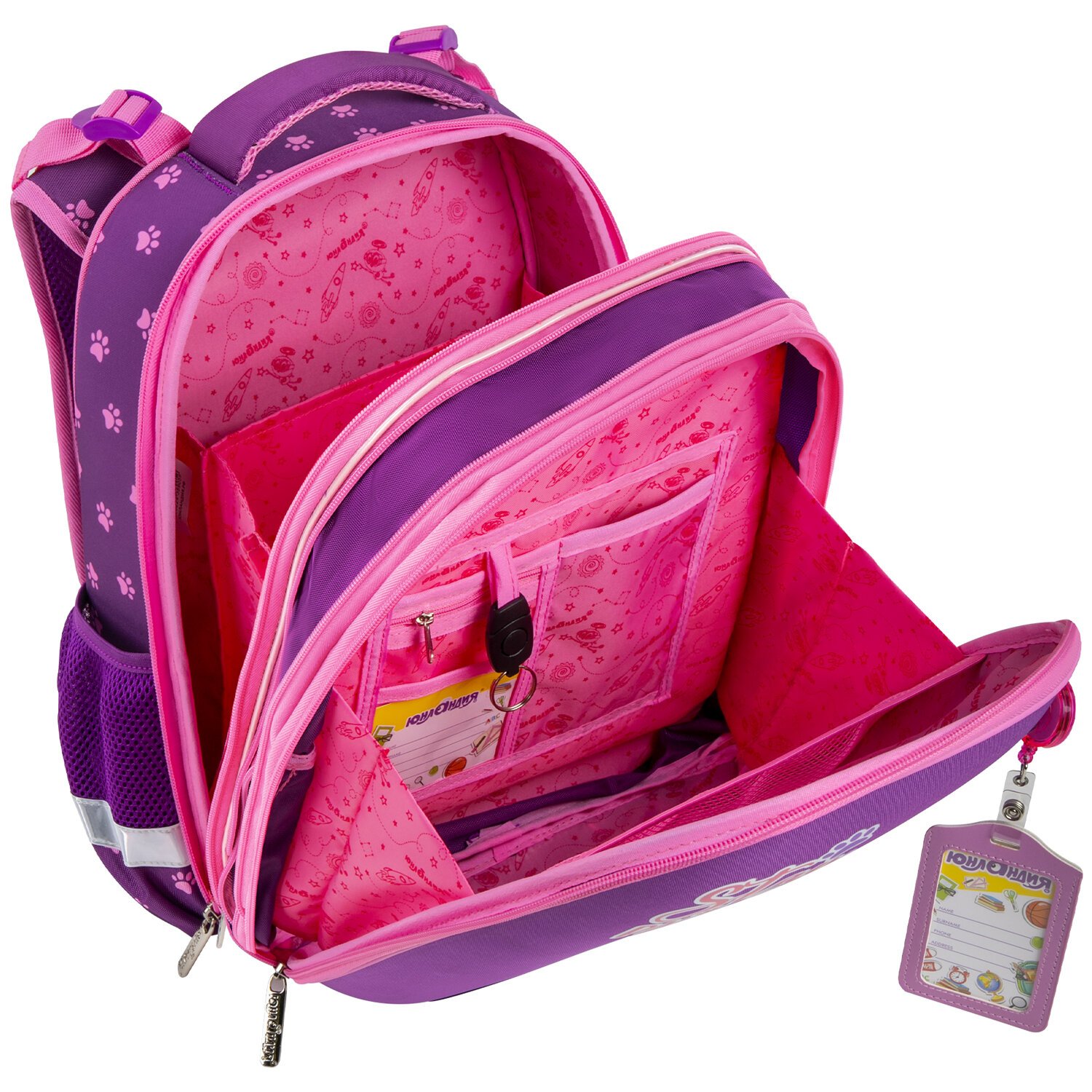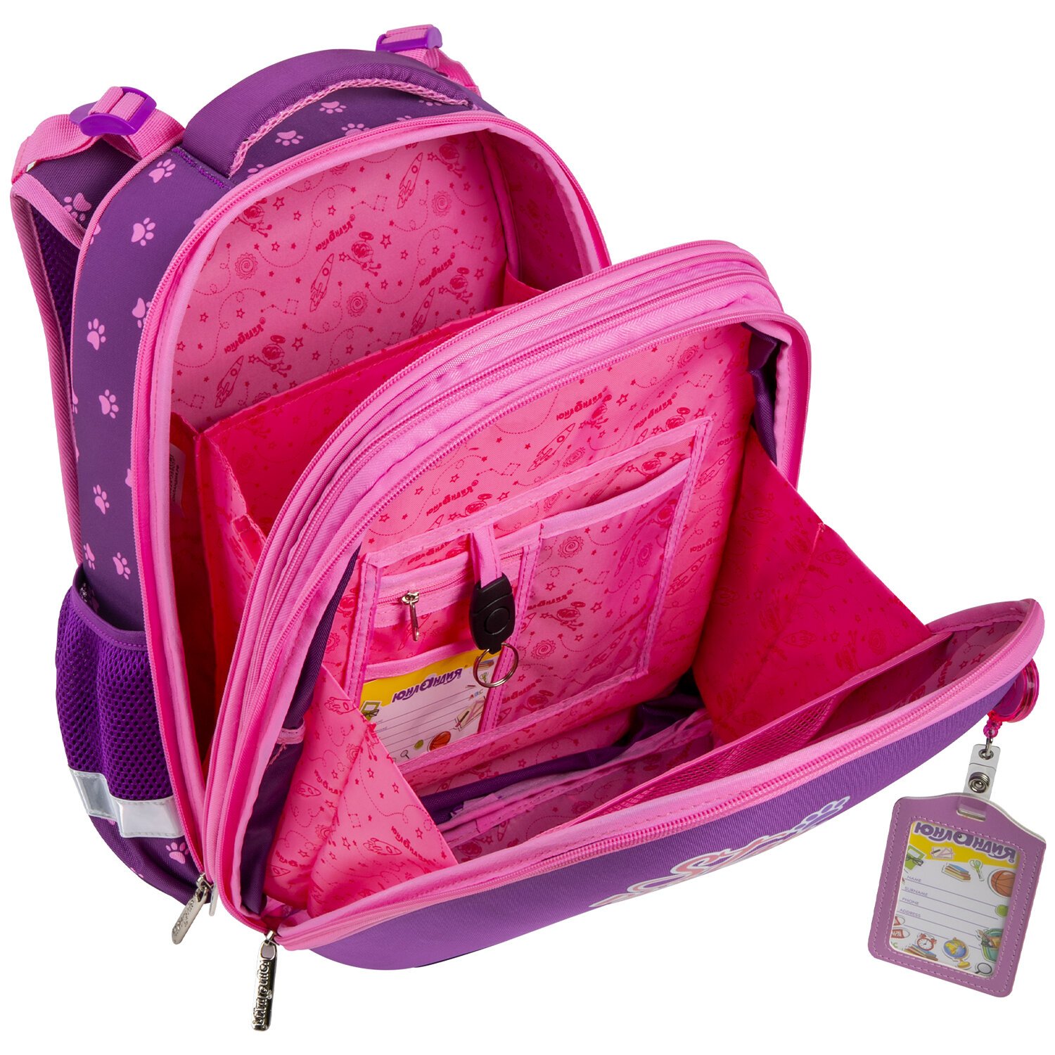 В основном отделении ранца можно легко и быстро разместить учебники и тетради между плотными перегородками. Внутри фронтального отделения находится органайзер для канцтоваров, именная карточка, карман для телефона, карабин для ключей и большое отделение из сетки. Такая организация пространства поможет держать принадлежности в сохранности и приучить ребенка к порядку. Ранец широко раскрывается, повышая удобство использования, а за счёт боковых перегородок содержимое не выскользнет из ранца.