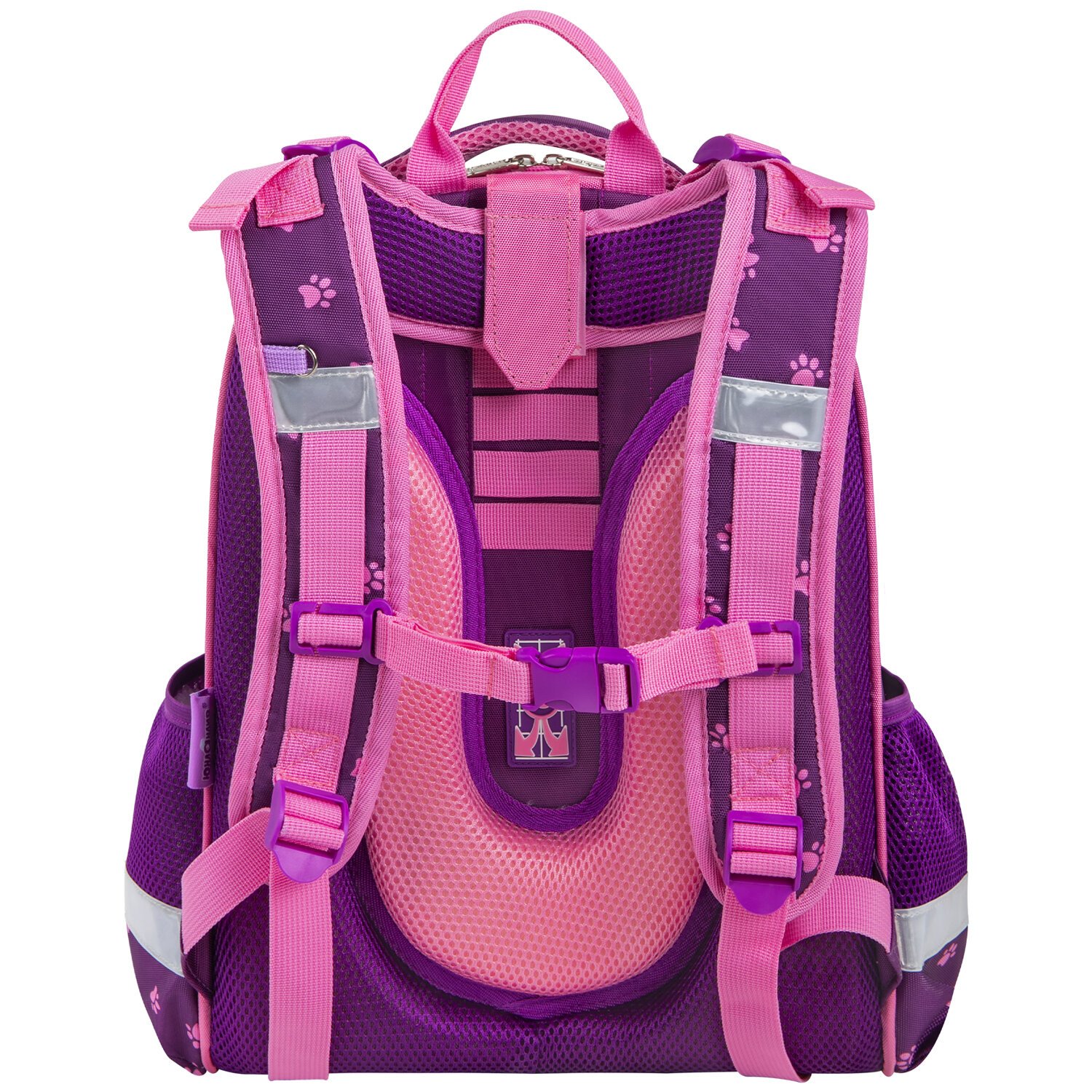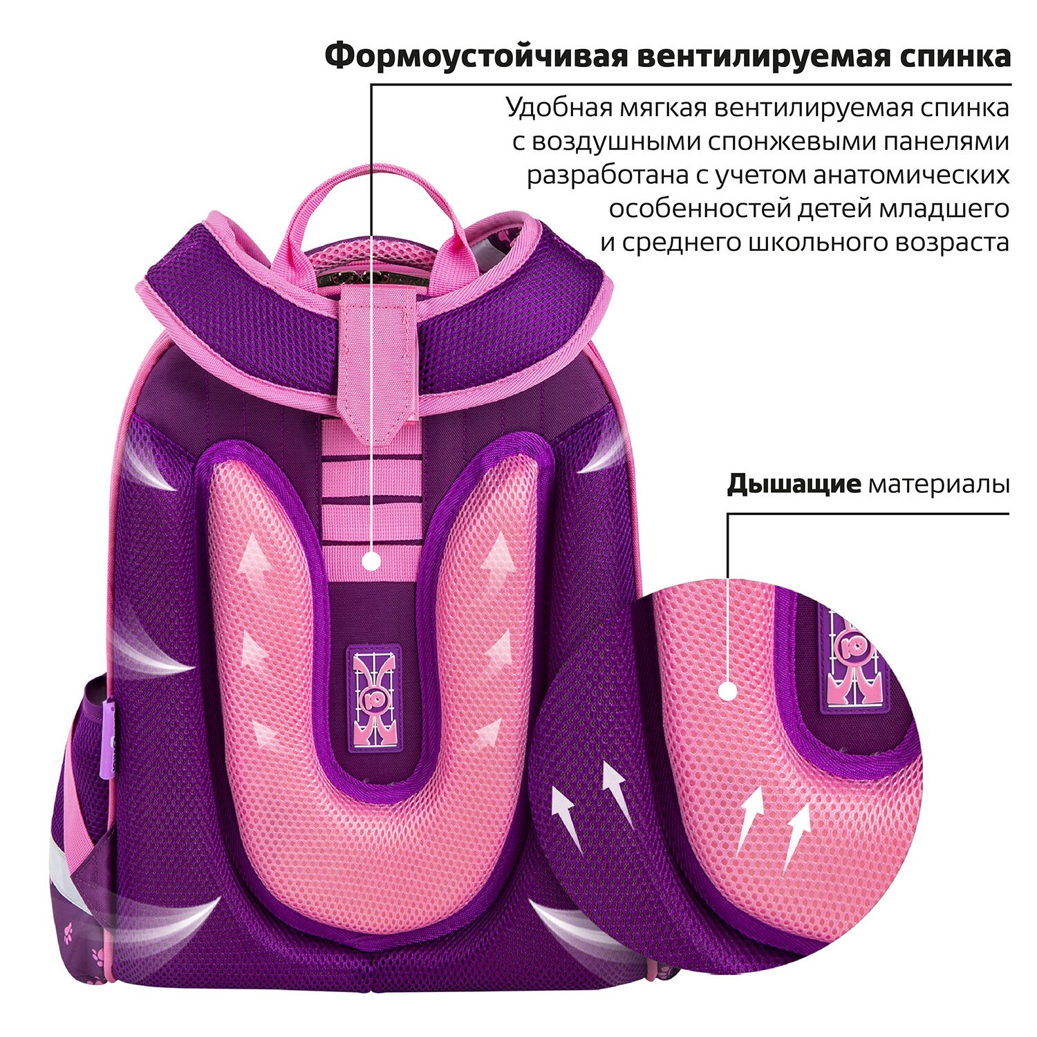 Удобная мягкая вентилируемая спинка с воздушными спонжевыми панелями разработана с учетом анатомических особенностей детей младшего школьного возраста. При правильной регулировке ранец будет практически не ощущаться на плечах и не будет доставлять дискомфорт при носке. В процессе эксплуатации равномерное распределение нагрузки позволит сохранить правильную осанку!