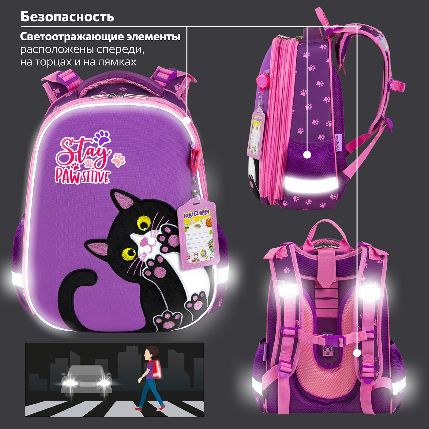 Светоотражающие элементы ранца расположены спереди, на торцах и на лямках. Они необходимы для безопасности ребенка в темное время суток.