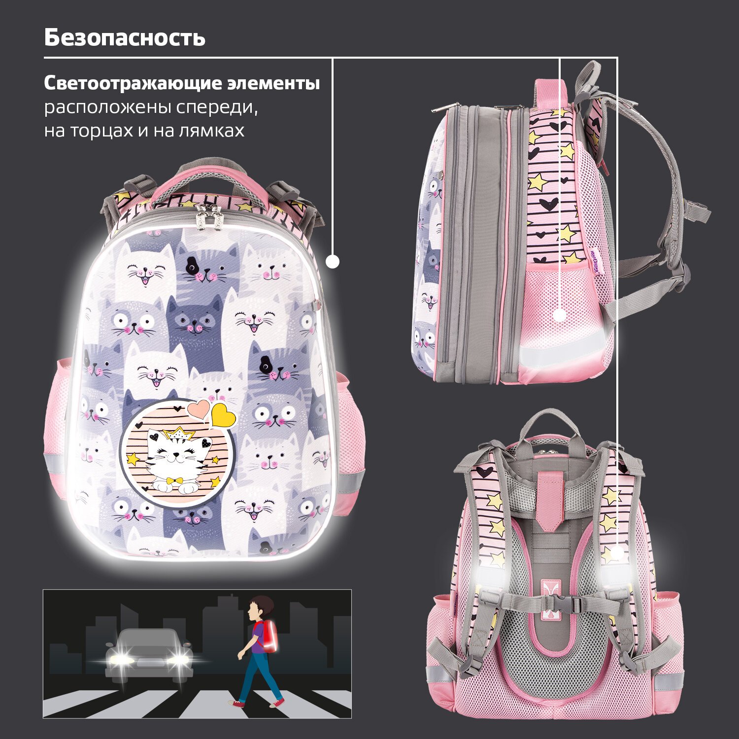 Светоотражающие элементы ранца расположены спереди, на торцах и на лямках. Они необходимы для безопасности пользователя в темное время суток.