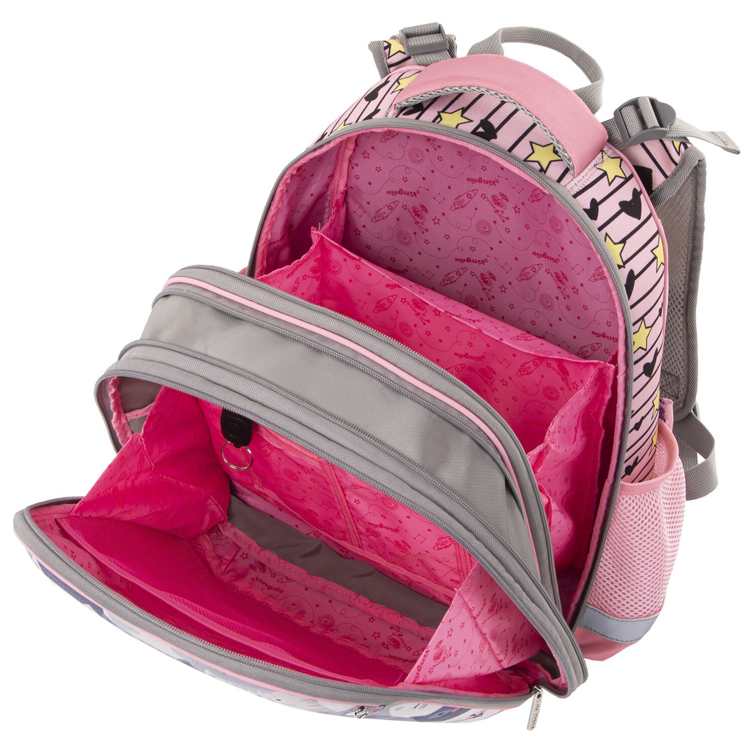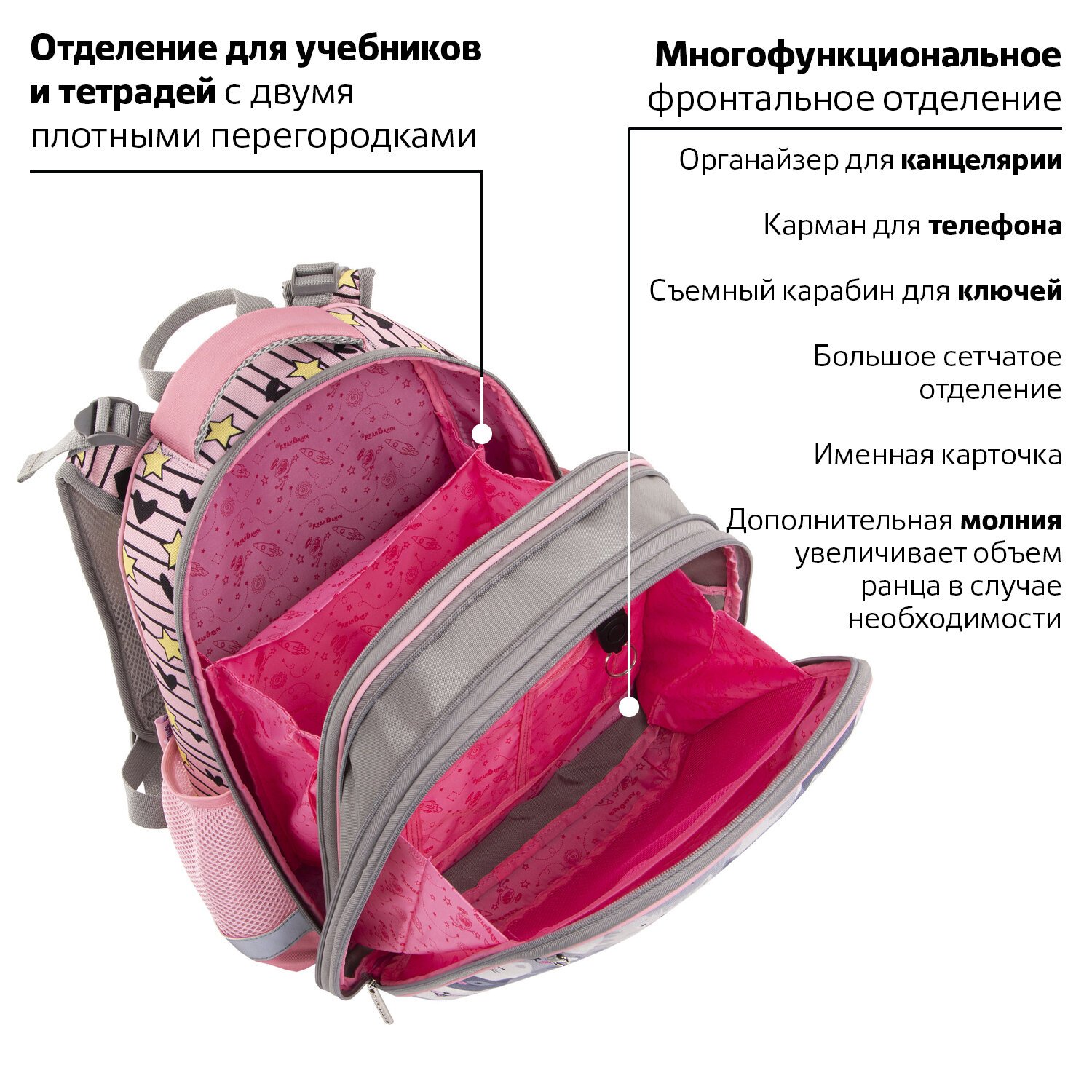В основном отделении ранца можно легко и быстро разместить учебники и тетради между плотными перегородками. Внутри фронтального отделения находится органайзер для канцтоваров, именная карточка, карман для телефона, карабин для ключей и большое отделение из сетки. Такая организация пространства поможет держать принадлежности в сохранности и приучить ребенка к порядку. Ранец широко раскрывается, повышая удобство использования, а за счёт боковых перегородок содержимое не выскользнет из ранца.