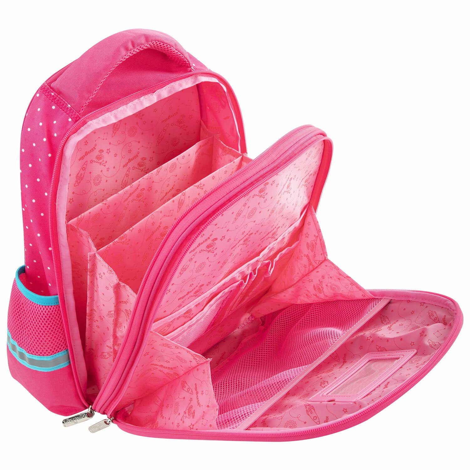 В основном отделении ранца можно легко и быстро разместить учебники и тетради между двумя плотными перегородками. Внутри фронтального отделения находится органайзер для канцтоваров, именная карточка, карман для телефона и большое отделение из сетки. Такая организация пространства поможет держать принадлежности в сохранности и приучить ребенка к порядку. Ранец широко раскрывается, повышая удобство использования, а за счёт боковых перегородок содержимое не выскользнет из ранца.