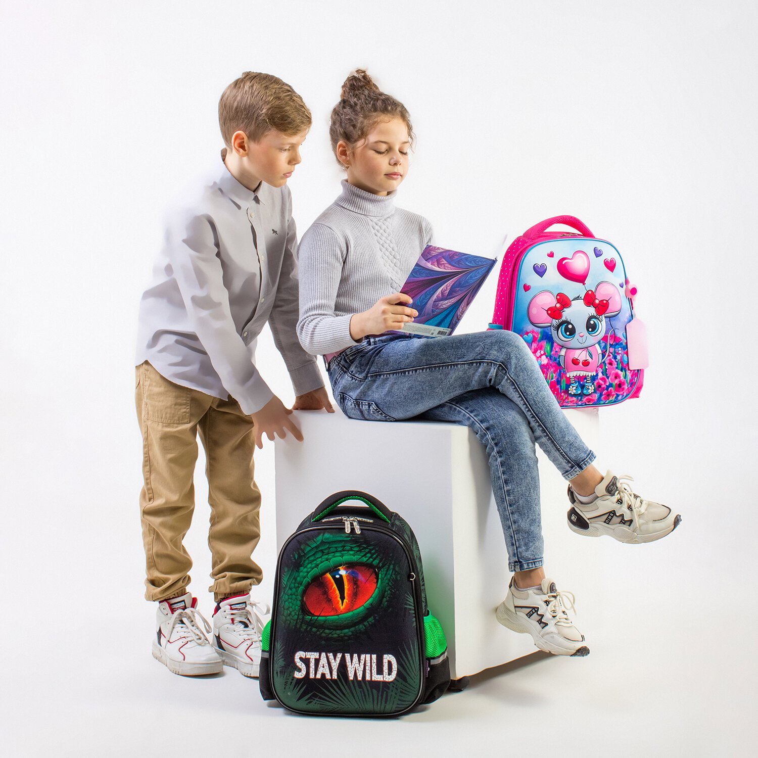 На передней панели ранца реализован уникальный 3D-эффект - выпуклое рельефное изображение мышки! Для печати использованы яркие неоновые краски.